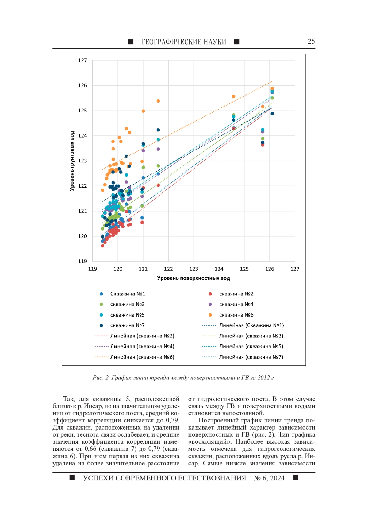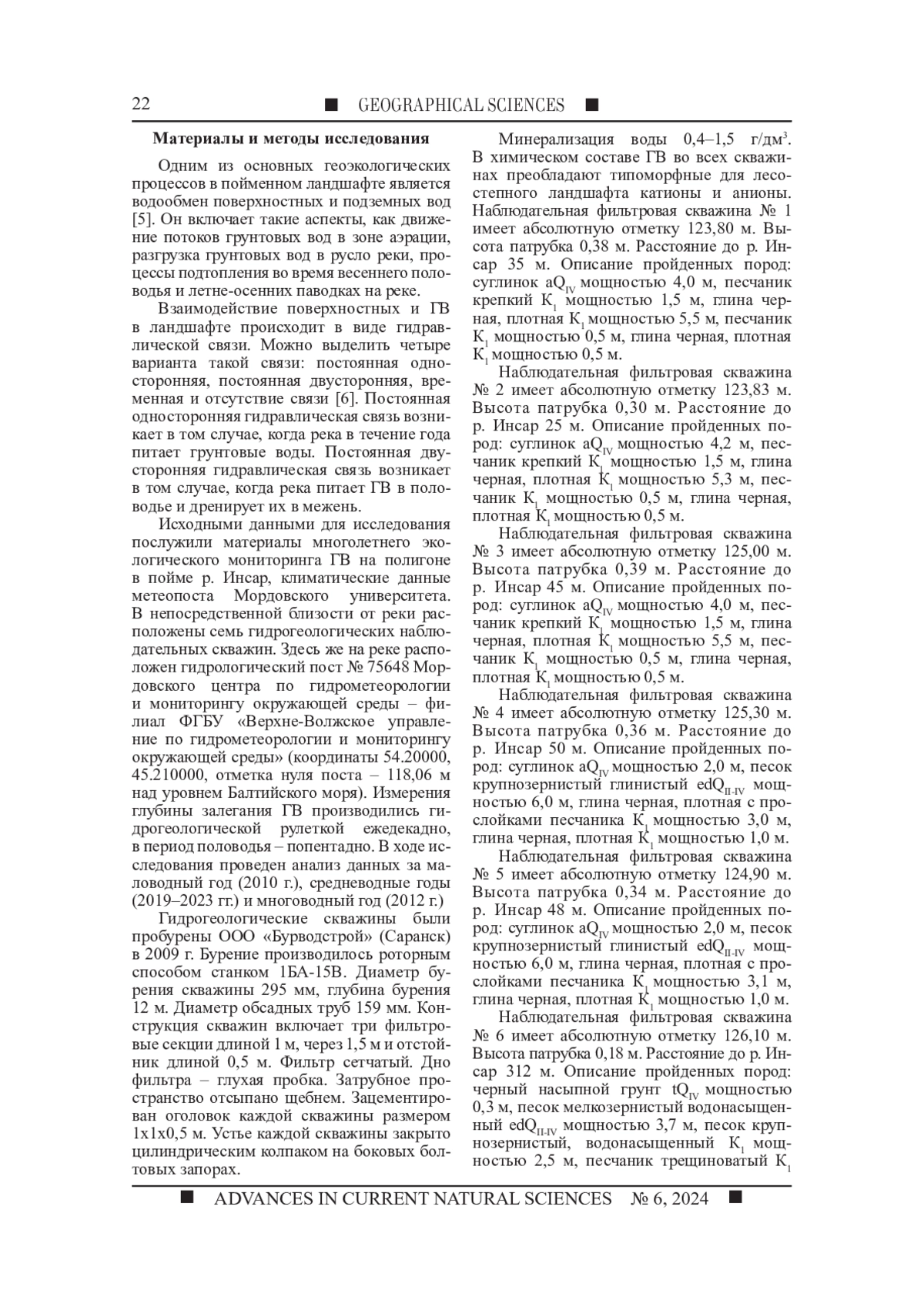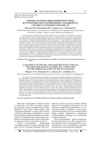 Статья посвящена вопросам взаимодействия поверхностных и грунтовых вод в пойменных ландшафтах. Актуальность темы исследования определяется тем, что поверхностные и грунтовые воды являются важнейшими компонентами любого пойменного ландшафта. Они во многом определяют его морфологическую структуру и процессы функционирования. Цель исследования - анализ взаимосвязи поверхностных и грунтовых вод, создание математической модели, описывающей их взаимодействие для обоснованного решения локальных геоэкологических проблем. Использованы общенаучные, картографические и специальные полевые гидрологические и гидрогеологические методы исследования. В ходе исследования выявлены основные режимообразующие факторы и годовая динамика грунтовых и поверхностных вод. Режим выпадения атмосферных осадков главным образом определяет динамику как грунтовых, так и речных вод. Авторами на основе данных экологического мониторинга произведена оценка взаимосвязи поверхностных и грунтовых вод. Для количественной оценки взаимосвязи грунтовых вод и поверхностных вод р. Инсар был рассчитан коэффициент линейной корреляции Пирсона. В ходе исследования проведен анализ данных за маловодный год (2010 г.), средневодные годы (2019-2023 гг.) и многоводный год (2012 г.). Результаты исследования могут быть использованы для организации мониторинга грунтовых вод и планирования природоохранных мероприятий в пойменных ландшафтах.