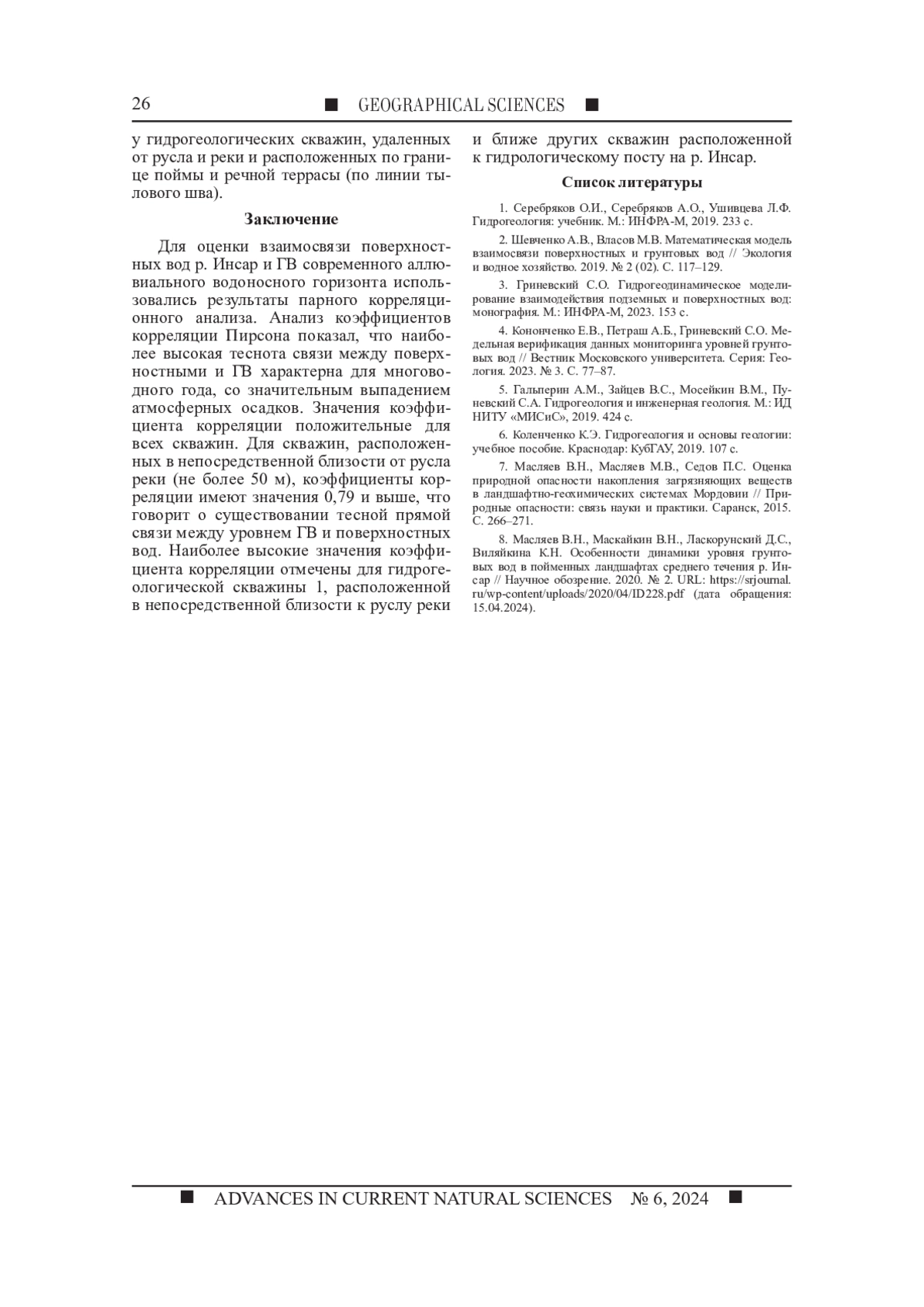 8. Масляев В.Н., Маскайкин В.Н., Ласкорунский Д.С., Виляйкина К.Н. Особенности динамики уровня грунтовых вод в пойменных ландшафтах среднего течения р. Инсар // Научное обозрение. 2020. № 2. - С. 8. EDN: EOTKYO