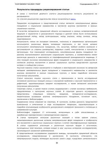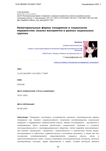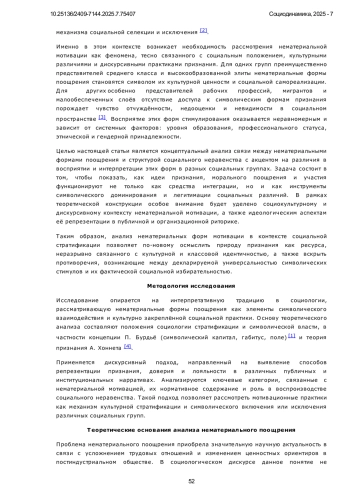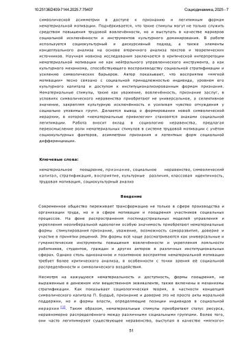 Предметом настоящего исследования являются нематериальные формы поощрения как элемент социокультурного механизма воспроизводства социальной иерархии и поддержания символической власти. Объект исследования - восприятие и интерпретация таких стимулов различными социальными группами в условиях постиндустриального и стратифицированного общества. Автор подробно рассматривает, как понятия «признание», «уважение», «вовлечённость» и «ценностная миссия труда» конструируются в публичном, управленческом и культурном дискурсах, а также как они по-разному интерпретируются представителями среднего класса, элиты и маргинализированных групп. Анализ охватывает институциональные контексты, включая корпоративную культуру, сферу образования и медиа. Особое внимание уделено символической асимметрии в доступе к признанию и легитимным формам нематериальной мотивации. Подчёркивается, что такие стимулы могут не только служить средством повышения трудовой вовлечённости, но и выступать в качестве маркеров социальной исключённости и инструментов культурного доминирования. В работе используется социокультурный и дискурсивный подход, а также элементы концептуального анализа на основе вторичного анализа текстов и теоретических источников. Научная новизна исследования заключается в критической интерпретации нематериальной мотивации не как нейтрального управленческого инструмента, а как культурного механизма, способствующего воспроизводству социальной стратификации и усилению символических барьеров. Автор показывает, что восприятие «мягкой мотивации» тесно связано с социальной принадлежностью индивида, уровнем его культурного капитала и доступом к институционализированным формам признания. Нематериальные стимулы, такие как уважение, вовлечённость, признание заслуг, в условиях символического неравенства приобретают не универсальное, а селективное значение, закрепляя культурную исключённость и усиливая чувство отчуждения у социально уязвимых групп. Делается вывод о формировании новой символической иерархии, в которой «нематериальные привилегии» становятся знаками социальной легитимации. Работа вносит вклад в социологию неравенства, предлагая переосмысление роли нематериальных стимулов в системе трудовой мотивации с учётом социокультурных факторов, асимметрии признания и латентных форм социальной дифференциации.
