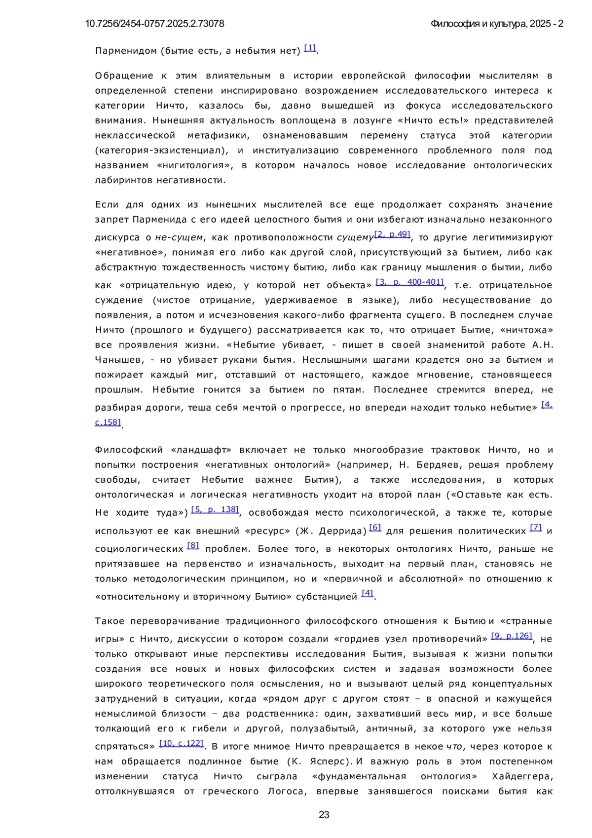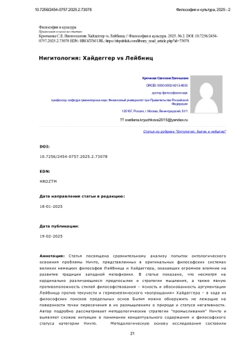 КРЮЧКОВА С. Е. НИГИТОЛОГИЯ: ХАЙДЕГГЕР VS ЛЕЙБНИЦ // ФИЛОСОФИЯ И КУЛЬТУРА. 2025. № 2