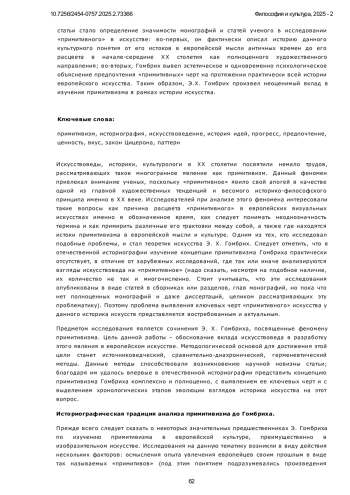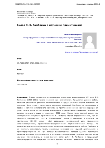 Статья посвящена исследованиям известного искусствоведа XX века Э. Х. Гомбриха (1909-2001) такого явления как примитивизм. Предметом данной работы является указанный феномен «примитивного» в трудах ученого второй половины XX столетия. Цель статьи - представить эволюцию воззрений Гомбриха на примитивизм в теории и истории европейского искусства на протяжении всей его научной карьеры: от работ 1950-х годов до последней монографии «Предпочтение примитива: эпизоды из истории западного вкуса и искусства» 2002 года. Более того, важной целью при исследовании концепции примитивизма Э. Гомбриха станет определение того, как он объяснял эстетическую тягу к “примитивным” темам в искусстве и культуре на протяжении XIX-XX веков. Для достижения поставленной цели применяется источниковедческий, сравнительно-диахронический, герменевтический методы. На данной методологической основе стало возможно проанализировать работы Гомбриха и их контекст, сопоставить тексты различных периодов его научной деятельности и проинтерпретировать их. При помощи вышеописанных методов удалось проследить развитие взглядов исследователя и установить определенные хронологические этапы изучения примитивизма, а также выявить связи работ Э. Гомбриха с предыдущей историографической традицией анализа данного явления. Важнейшим выводом этой статьи стало определение значимости монографий и статей ученого в исследовании «примитивного» в искусстве: во-первых, он фактически описал историю данного культурного понятия от его истоков в европейской мысли античных времен до его расцвета в начале-середине XX столетия как полноценного художественного направления; во-вторых, Гомбрих вывел эстетическое и одновременно психологическое объяснение предпочтения «примитивных» черт на протяжении практически всей истории европейского искусства. Таким образом, Э. Х. Гомбрих произвел неоценимый вклад в изучение примитивизма в рамках истории искусства.