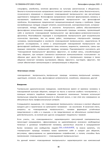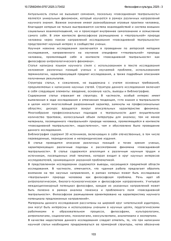 Данная работа посвящена анализу “театральной” природы человека, проявляющей себя в повседневной культуре общения. Работа сосредоточена на осмыслении трех потенциальных направлений - антропологическом, биолого-психологическом, философском; задействованы понятия «повседневной театральности» и «театральной» природы человека как наиболее близкие концептуально. «Повседневная театральность» характеризуется как комплексный открытый самоорганизующийся феномен адаптации, приспособления человека к внешним и внутренним вызовам; как феномен, проявляющий «театральную» природу человека и реализующий ее экзистенциальный потенциал в социуме; как феномен с ярко выраженной социальной, коммуникативной, социокультурной направленностью, реализующий себя в повседневной культуре общения. Антропологическое направление исследования позволяет отследить первые (ранние) примеры применения повседневного «театрального» взаимодействия людей, характер взаимодействия, специфику, атрибутику, влияние феномена на культуру (религиозную и обыденную). Биолого-психологическое направление помогает заметить особую связь биологического, психического отражения и отражения «повседневной театральности» как регуляторов адаптивного поведения. Философское направление помогает формулировать вопросы и выстраивать проблемное поле «повседневной театральности» как философской проблемы. Исследование предполагает междисциплинарный подход к проблеме. Среди востребованных методов следует отметить аналитический, компаративистский, историко-культурный; методы обобщения и аналогии. Актуальность работы обуславливается философским осмыслением специфики «театральной» природы человека, проявляющей себя в контексте «повседневной театральности» как философско-антропологического феномена. Многообразие подходов к исследованию театральности дает внушительное количество трактовок, тем не менее работ, посвященных «театральной» природе человека, проявляющейся в контексте «повседневной театральности», недостаточно. В данном исследовании, в связи с актуализацией повседневной театральности как философской проблемы, озвучиваются темы иллюзии, видимости, кажимости, грезы как ведущих элементов «театральной» природы человека. Подчеркивается значимость для “повседневной театральности” феномена «Другого», их особая связь, способствующая типу общения, при котором становится возможным коммуникативное «скольжение» по образам друг друга без погружения в «Другого»; а «театральная» природа в таком общении помогает человеку выстраивать образы «Другого», выглядеть «Другим», тем самым обеспечивая коммуникацию и самореализацию в обществе.