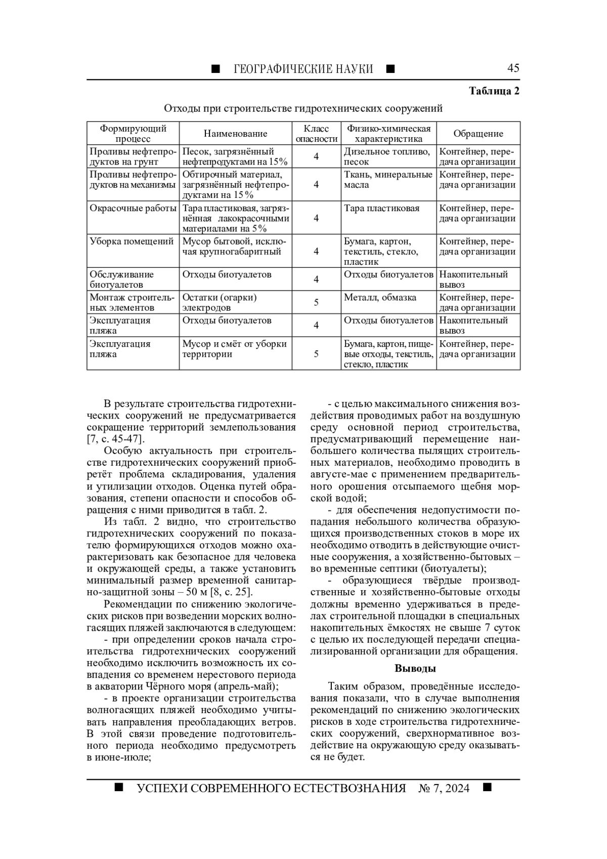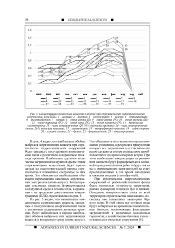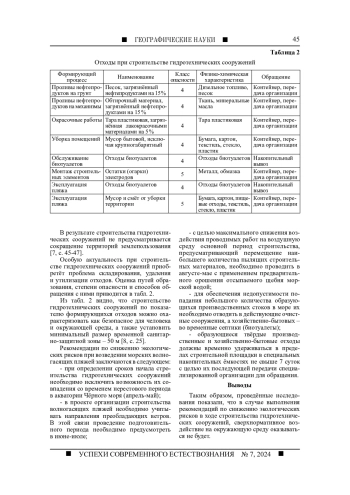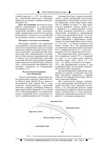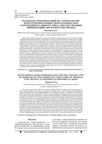 В работе рассмотрены актуальные вопросы загрязнения окружающей среды при строительстве берегоукрепительных гидротехнических сооружений. На основе результатов анализа плановых сроков, объёмов и видов работ, выполняемых при возведении двух бун, удерживающих поступающие на берег волны, рекреационной зоны и пандуса для маломобильных категорий населения произведены расчёты выбросов и концентраций загрязняющих веществ в воздушной среде, которые осуществлялись с использованием программного обеспечения, основанного на утверждённых методиках. С учётом специфики природно-климатических условий Черноморского побережья Кавказа определены сроки начала подготовительного и основного периодов выполнения работ, снижающие экологические риски при строительстве гидротехнических сооружений. Определены основные производственные процессы, обусловливающие загрязнение воздушной, водной, земельной среды и образование отходов. По результатам проведённых исследований выяснилось, что наибольшие количества выбрасываемых токсичных веществ в подготовительный период строительства не связаны с их наибольшими концентрациями в воздушной среде в следствие их естественного перемещения в море преобладающими в июне-июле северными ветрами. Ввиду небольших объёмов и краткосрочности воздействия повышенные концентрации загрязнителей в воздушной среде в основной период строительства легко снижаются орошением перемещаемых строительных материалов имеющейся в избытке морской водой. В результате проделанной работы выяснилось, что отторжение береговой зоны шириной 35 м и длиной 170 м будет неизбежно и продиктовано размерами двух возводимых бун и формируемых морских волногасящих пляжей. При этом небольшое количество образующихся в результате производственной деятельности отходов не окажет значимого воздействия на окружающую среду ввиду их своевременной передачи специализированной организации для обращения.