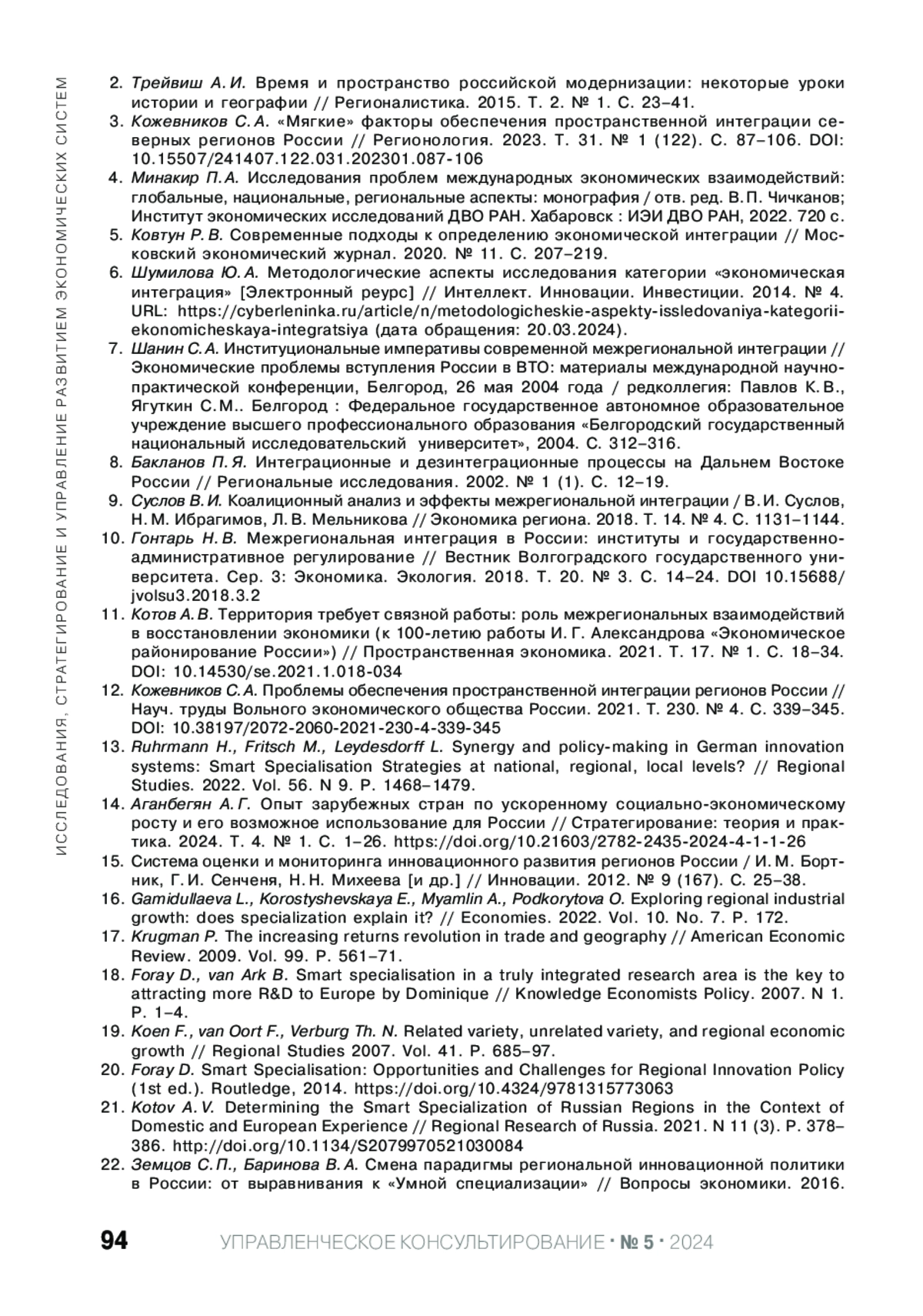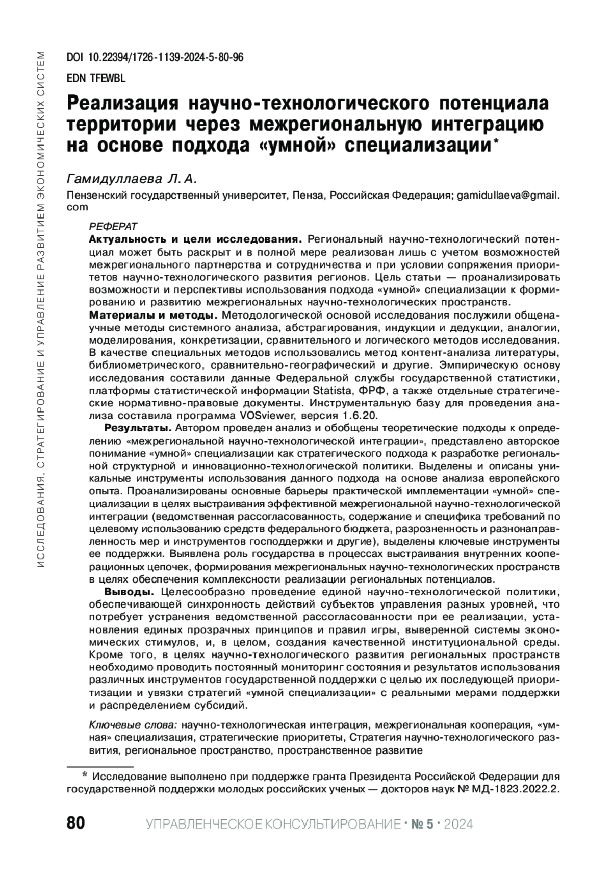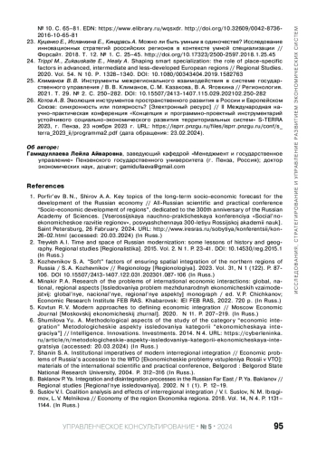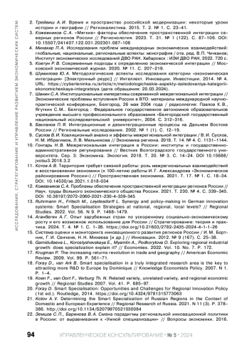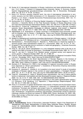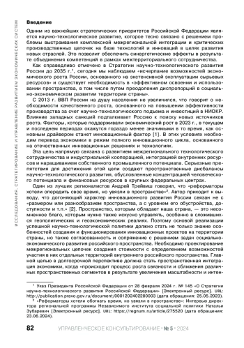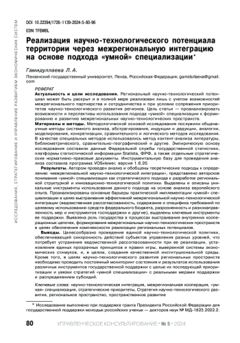 Статья: РЕАЛИЗАЦИЯ НАУЧНО-ТЕХНОЛОГИЧЕСКОГО ПОТЕНЦИАЛА ТЕРРИТОРИИ ЧЕРЕЗ МЕЖРЕГИОНАЛЬНУЮ ИНТЕГРАЦИЮ НА ОСНОВЕ ПОДХОДА "УМНОЙ" СПЕЦИАЛИЗАЦИИ (2024)