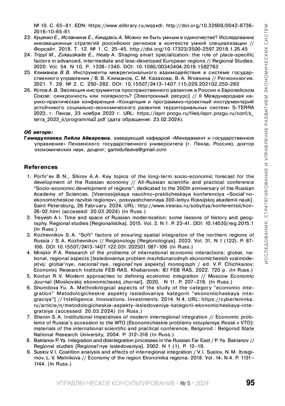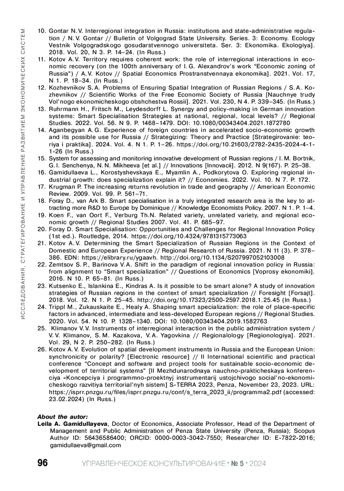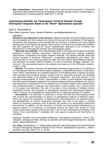 ГАМИДУЛЛАЕВА Л. А. РЕАЛИЗАЦИЯ НАУЧНО-ТЕХНОЛОГИЧЕСКОГО ПОТЕНЦИАЛА ТЕРРИТОРИИ ЧЕРЕЗ МЕЖРЕГИОНАЛЬНУЮ ИНТЕГРАЦИЮ НА ОСНОВЕ ПОДХОДА "УМНОЙ" СПЕЦИАЛИЗАЦИИ // УПРАВЛЕНЧЕСКОЕ КОНСУЛЬТИРОВАНИЕ. 2024. № 5 (185)
