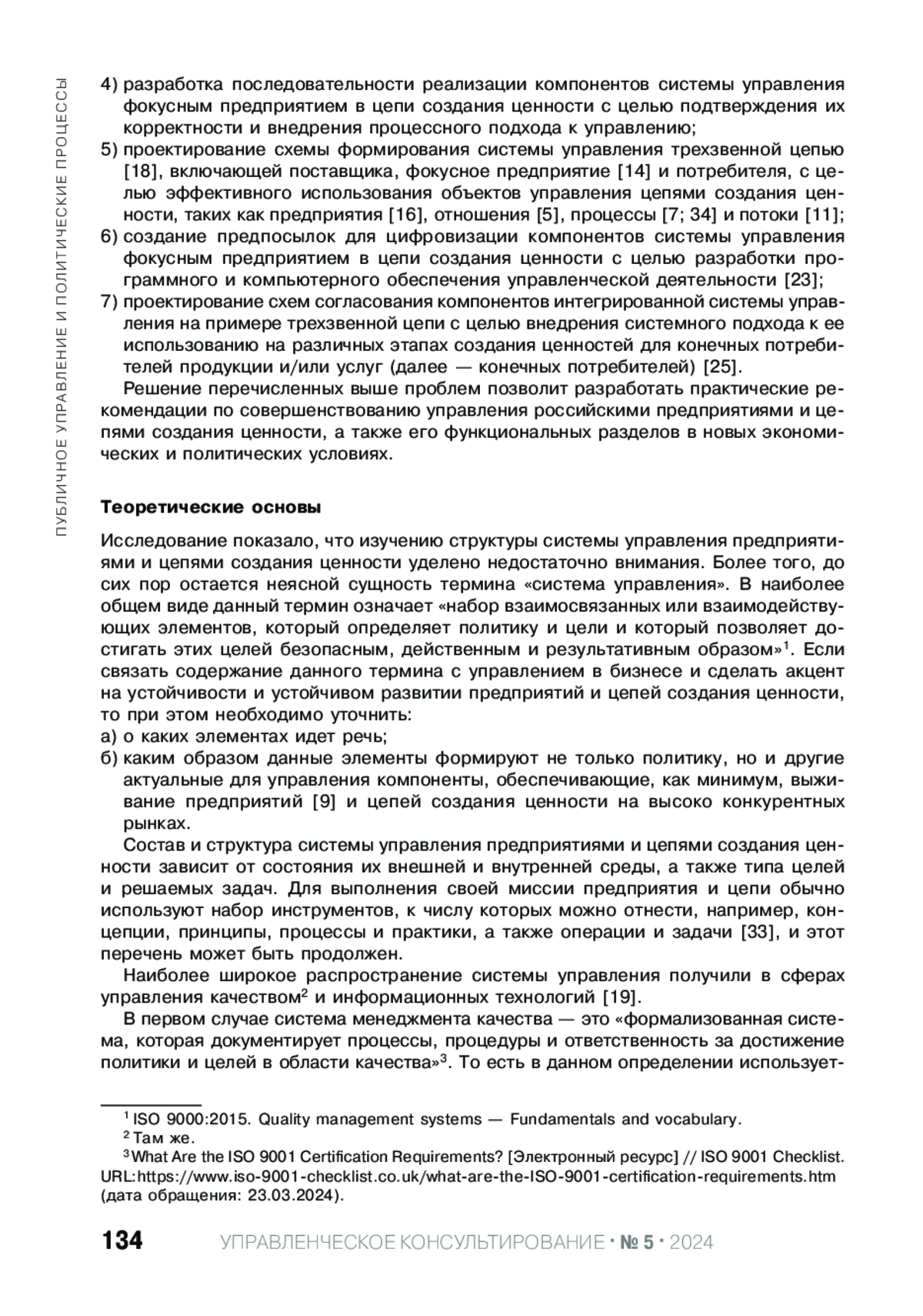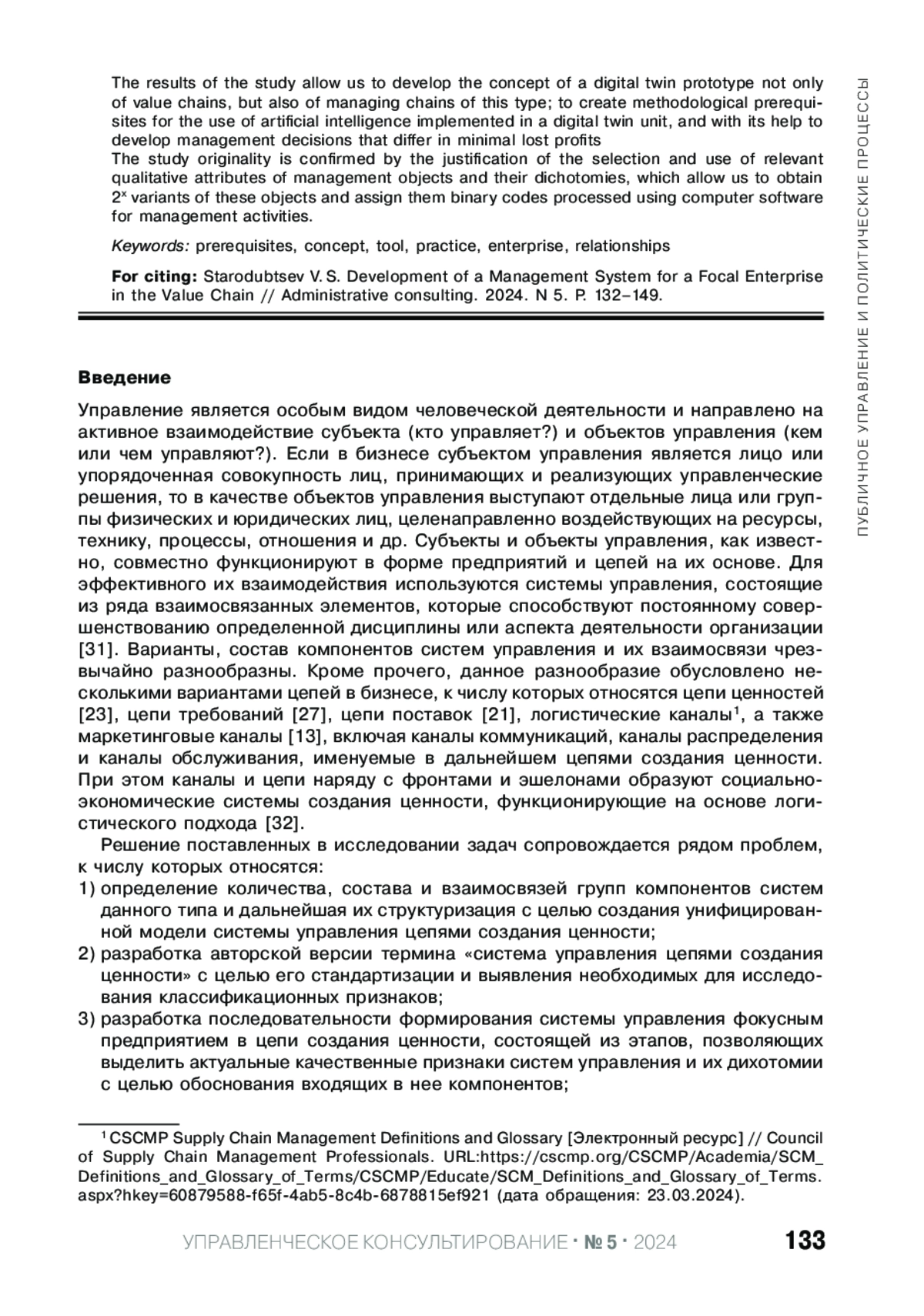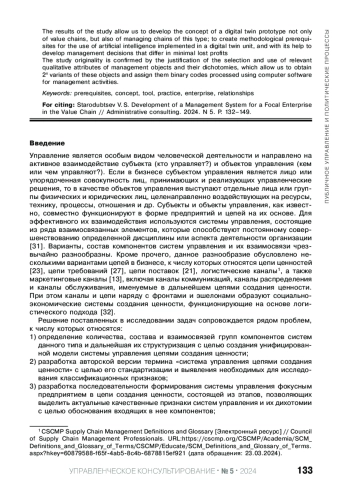 Целями статьи является обоснование компонентов системы управления фокусным предприятием трехзвенной цепи создания ценности, разработка последовательностей их формирования, а также создание методических предпосылок для цифровизации системы данного типа. К основным методам исследования относятся методы качественного исследования, реализуемые в следующей последовательности: терминологический анализ, дескрипторный и фасетный методы; методы синтеза и анализа, индукции и дедукции. В статье предложена уточненная версия термина «система управления цепями создания ценности», обоснованы ее базовые компоненты, элементы, а также взаимосвязи между ними; разработаны схемы формирования системы управления трехзвенной цепью, включающей поставщика, фокусное предприятие и потребителя; созданы предпосылки для цифровизации компонентов и элементов систем данного типа и процесса формирования интегрированных систем управления сетями в бизнесе. Результаты исследования позволяют разработать концепцию прототипа цифрового двойника не только цепей ценности, но и управления цепями данного типа; создать методические предпосылки для использования искусственного интеллекта, реализуемого в агрегате цифрового двойника, и с его помощью разрабатывать управленческие решения, отличающиеся минимальной упущенной выгодой. Оригинальность исследования подтверждается обоснованием выбора и использования актуальных качественных признаков объектов управления и их дихотомий, которые позволяют получить 2х варианта этих объектов и присвоить им двоичные коды, обработанные с помощью компьютерного программного обеспечения для управленческой деятельности.