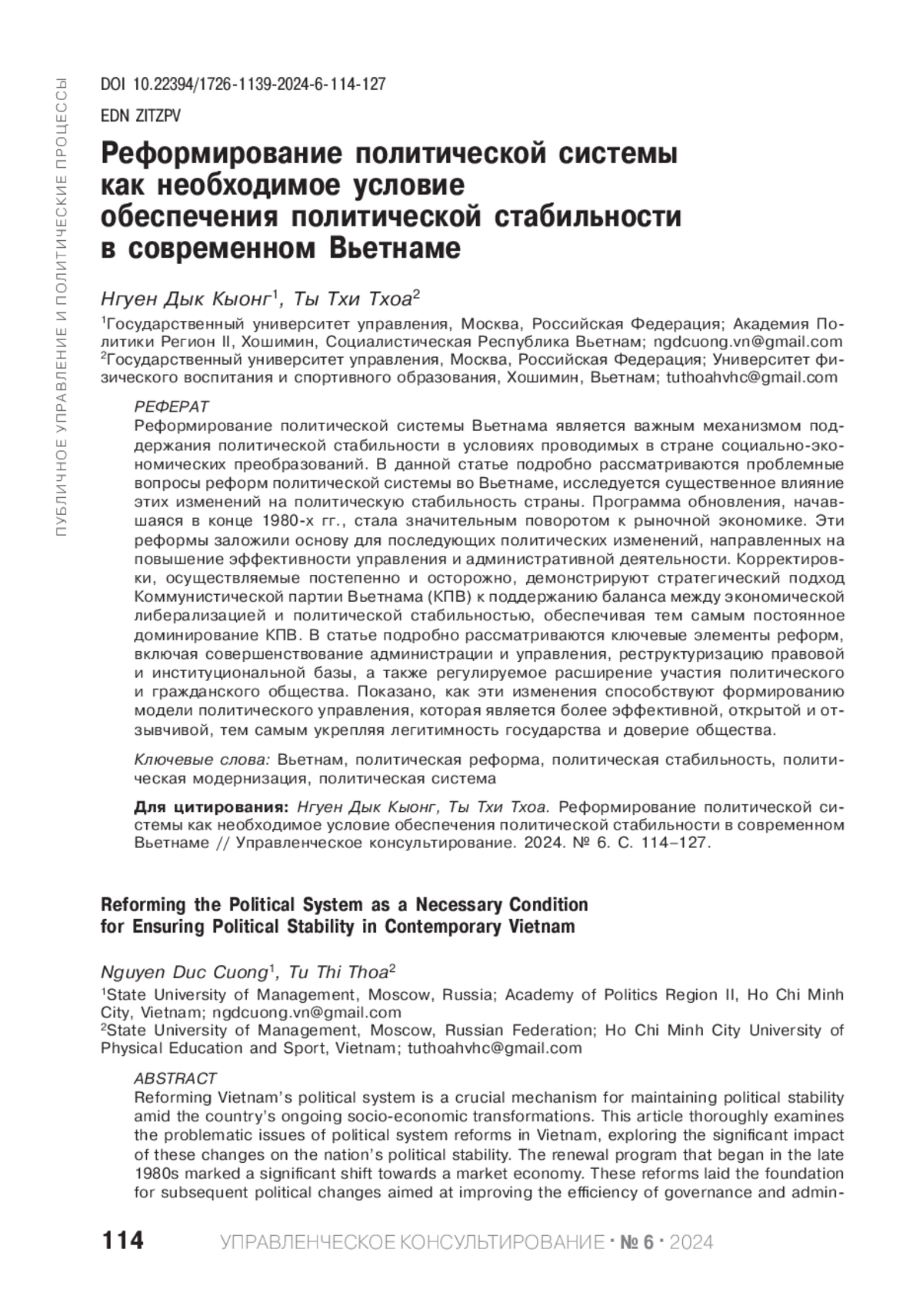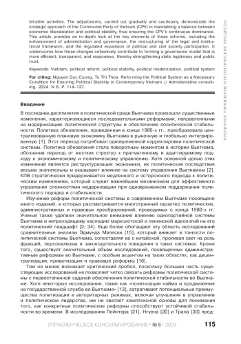 Реформирование политической системы Вьетнама является важным механизмом поддержания политической стабильности в условиях проводимых в стране социально-экономических преобразований. В данной статье подробно рассматриваются проблемные вопросы реформ политической системы во Вьетнаме, исследуется существенное влияние этих изменений на политическую стабильность страны. Программа обновления, начавшаяся в конце 1980-х гг., стала значительным поворотом к рыночной экономике. Эти реформы заложили основу для последующих политических изменений, направленных на повышение эффективности управления и административной деятельности. Корректировки, осуществляемые постепенно и осторожно, демонстрируют стратегический подход Коммунистической партии Вьетнама (КПВ) к поддержанию баланса между экономической либерализацией и политической стабильностью, обеспечивая тем самым постоянное доминирование КПВ. В статье подробно рассматриваются ключевые элементы реформ, включая совершенствование администрации и управления, реструктуризацию правовой и институциональной базы, а также регулируемое расширение участия политического и гражданского общества. Показано, как эти изменения способствуют формированию модели политического управления, которая является более эффективной, открытой и отзывчивой, тем самым укрепляя легитимность государства и доверие общества.