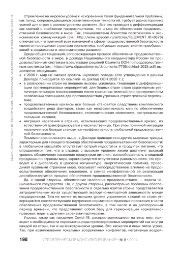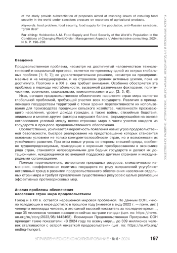 Продовольственная проблема, несмотря на достигнутый человечеством технологический и социальный прогресс, является по-прежнему одной из острых глобальных проблем [1; 5; 7]; ее удовлетворительное решение, несмотря на предпринимаемые и на международном, и на страновом уровнях активные усилия, пока не достигнуто. Поэтому и в XXI в. она требует внимания. Особенно обостряется эта проблема в периоды нестабильности, вызванной различными факторами: политическими, военными, социальными, климатическими и др