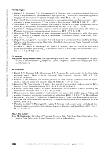 1. Бабич С. В., Доленина О. Е., Селеменева Е. А. Перспективы продовольственной безопасности в Евроазиатском экономическом пространстве // Известия Санкт-Петербургского государственного экономического университета. 2022. № 6 (138). С. 44-52. EDN: VZEPJQ