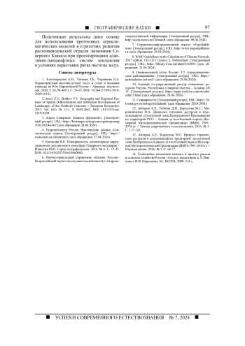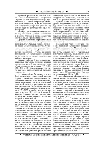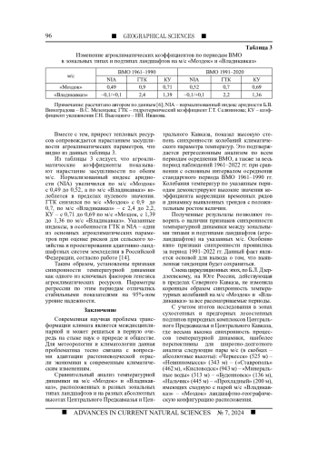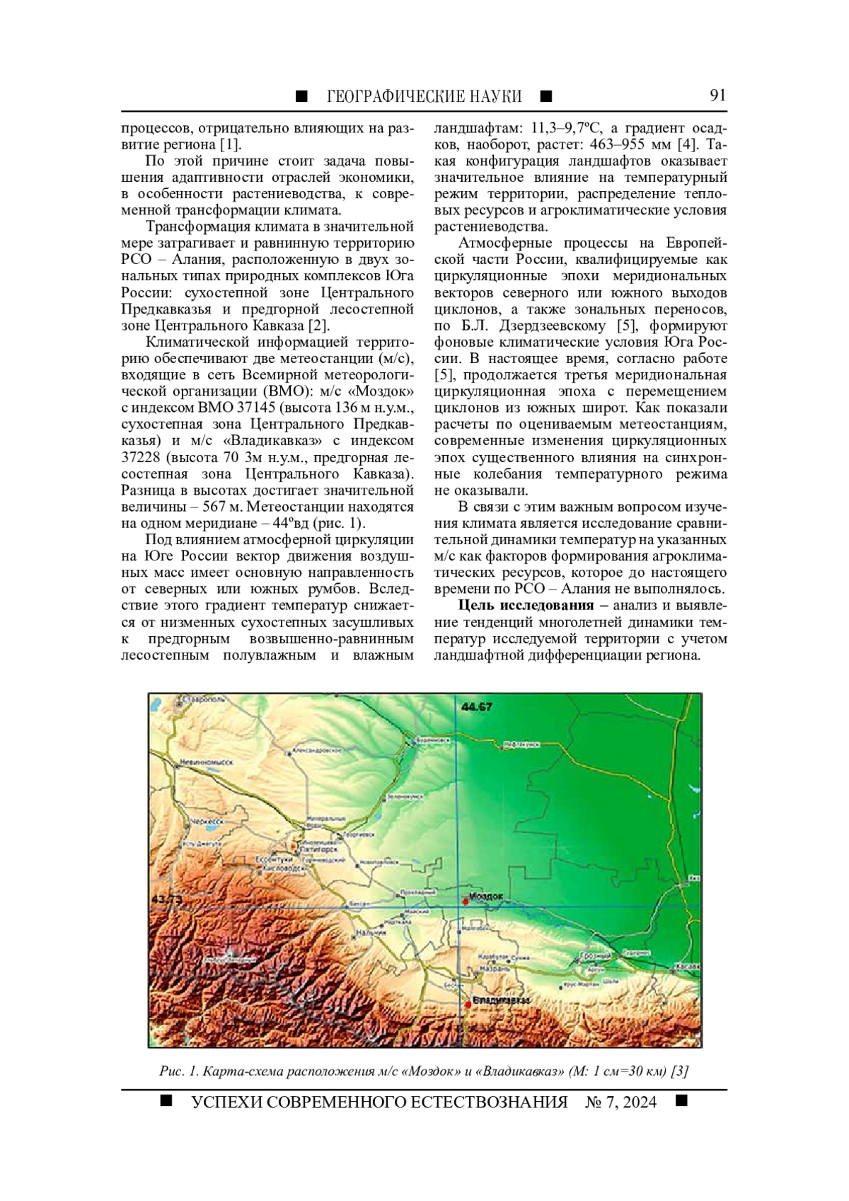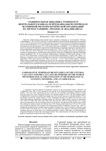 АЙЛАРОВ А. Е. СРАВНИТЕЛЬНАЯ ДИНАМИКА ТЕМПЕРАТУР ЦЕНТРАЛЬНОГО КАВКАЗА И ПРЕДКАВКАЗЬЯ ПО ПЕРИОДАМ ВСЕМИРНОЙ МЕТЕОРОЛОГИЧЕСКОЙ ОРГАНИЗАЦИИ НА МЕТЕОСТАНЦИЯХ "МОЗДОК" И "ВЛАДИКАВКАЗ" // УСПЕХИ СОВРЕМЕННОГО ЕСТЕСТВОЗНАНИЯ. 2024. № 7