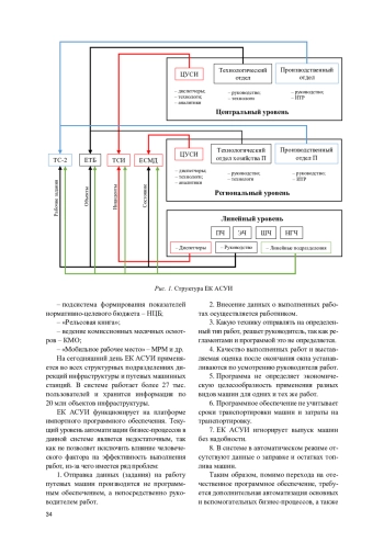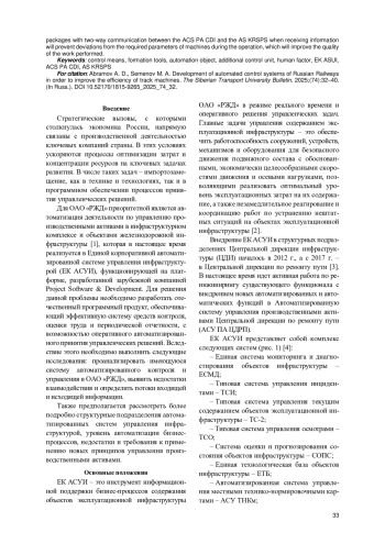 В статье подробно рассматривается структура ЕК АСУИ, взаимодействие ее модулей и подсистем, а также проблемы и упущения в работе путевых машин, связанные с взаимодействием подсистем Автоматизированной системы управления производственными активами Центральной дирекции инфраструктуры (АСУ ПА ЦДИ). Программные комплексы АСУ ПА ЦДИ и Автоматизированной системы контроля над работой специального подвижного состава (АС КРСПС) производят только сбор и анализ данных с путевых машин о количестве выполненных работ, но задание на их выполнение бригадам путевых машин по-прежнему выдается руководителем работ, из-за чего могут происходить ошибки в технологии выполняемых работ. Далее эти ошибки могут увеличиваться при занесении машинистами данных в программное обеспечение машин. Для повышения качества выполняемых путевыми машинами работ необходимо устранить человеческий фактор из этого процесса. Разработка и внедрение новой структуры программных комплексов с двухсторонней связью АСУ ПА ЦДИ и АС КРСПС при получении информации позволит не допустить отклонений от необходимых параметров машин в процессе работы и повысить качество выполняемых работ.