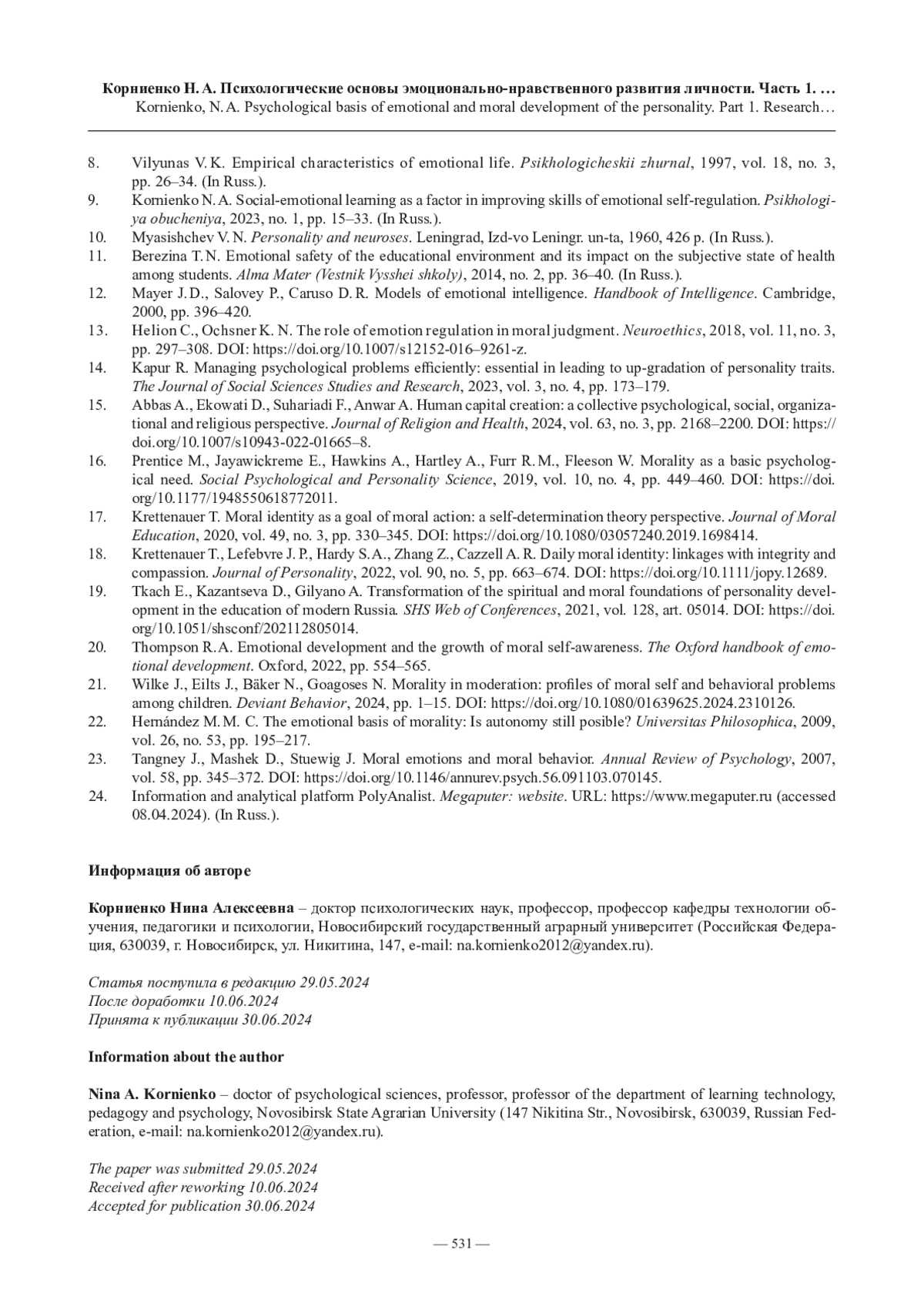 9. Корниенко Н. А. Социально-эмоциональное обучение как фактор совершенствования навыков эмоциональной саморегуляции // Психология обучения. 2023. № 1. С. 15-33.