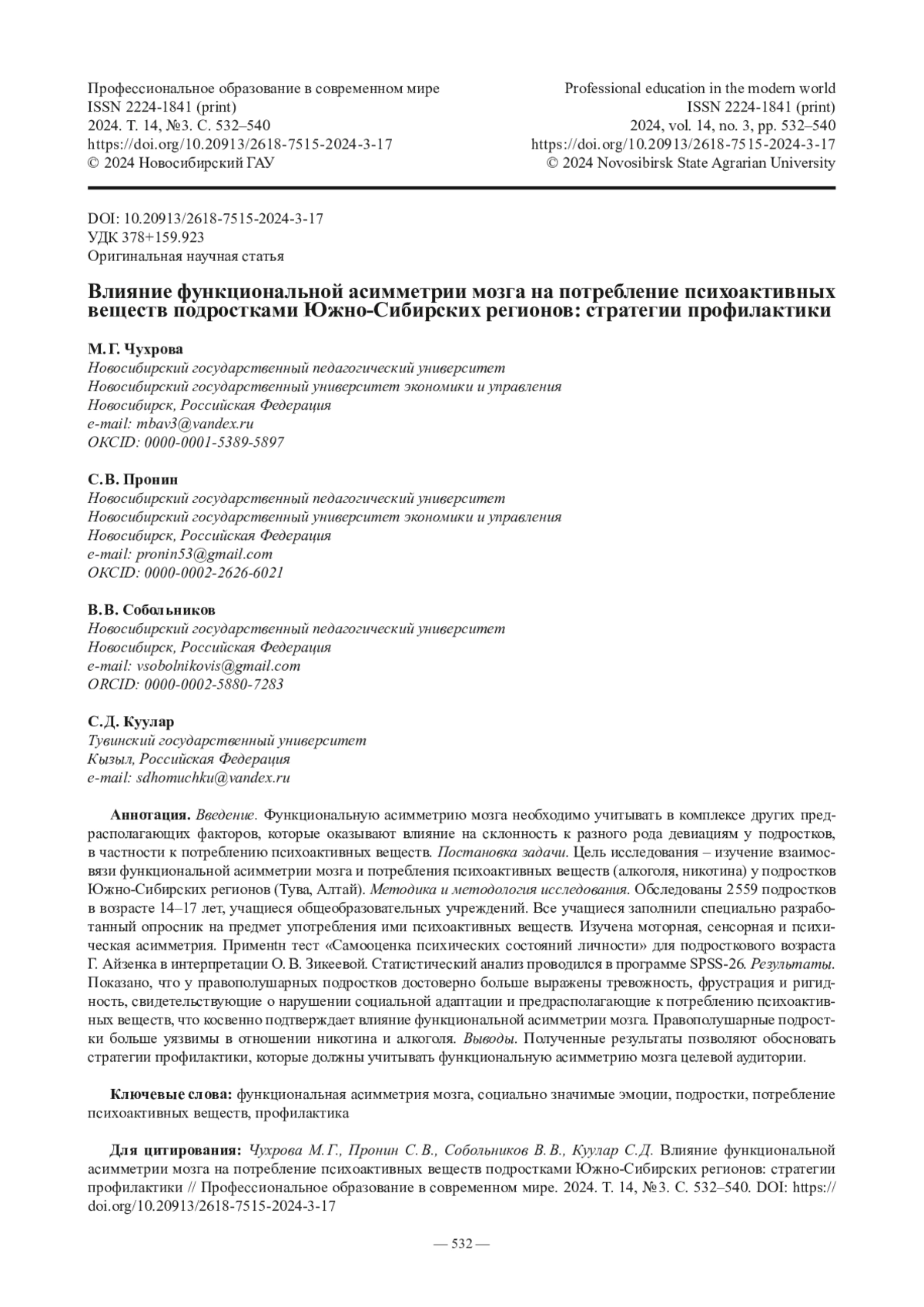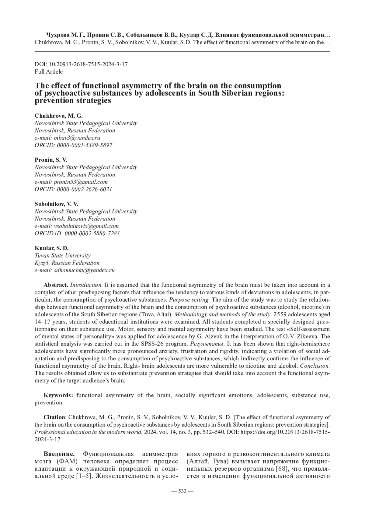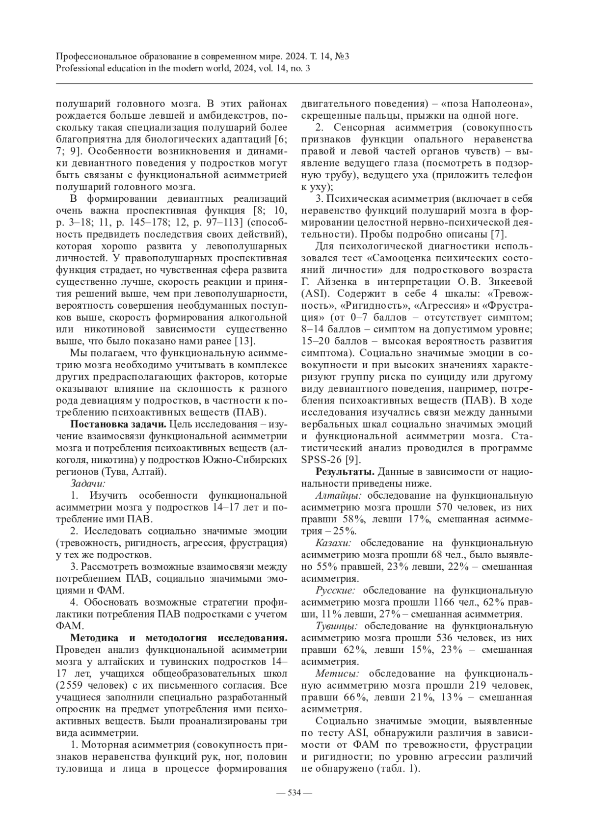 Методика и методология исследования. Обследованы 2 559 подростков в возрасте 14–17 лет, учащиеся общеобразовательных учреждений. Все учащиеся заполнили специально разработанный опросник на предмет употребления ими психоактивных веществ. Изучена моторная, сенсорная и психическая асимметрия. Применtн тест «Самооценка психических состояний личности» для подросткового возраста Г. Айзенка в интерпретации О. В. Зикеевой. Статистический анализ проводился в программе SPSS-26.