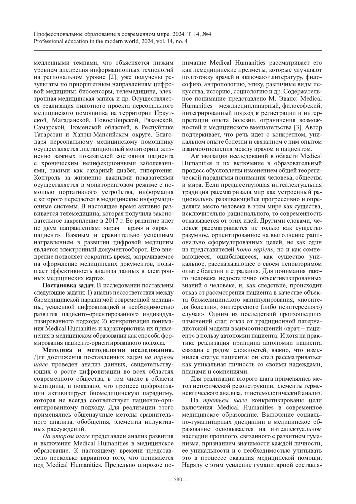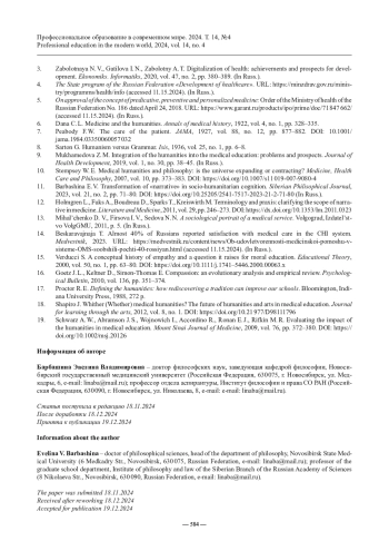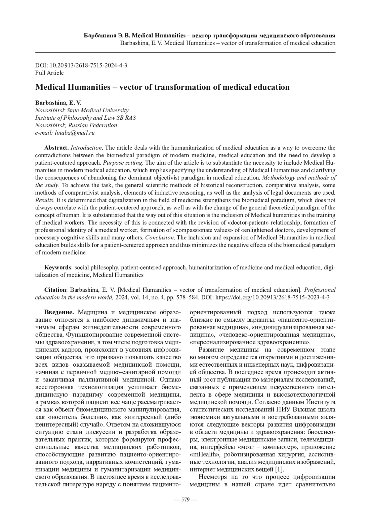 Результаты. Определено, что цифровизация в области медицины усиливает биомедицинскую парадигму, что не всегда соотносится с пациенто-ориентированным подходом, а также с изменением общетеоретической парадигмы понимания человека. Обосновано, что выходом из сложившейся ситуации является включение Medical humanities в подготовку медицинских работников. Необходимость этого связана с пересмотром взаимоотношений «врач – пациент», формированием профессиональной идентичности медицинского работника, формированием «сострадательных ценностей» «просвещенного врача», развитием необходимых когнитивных навыков и многим другим.