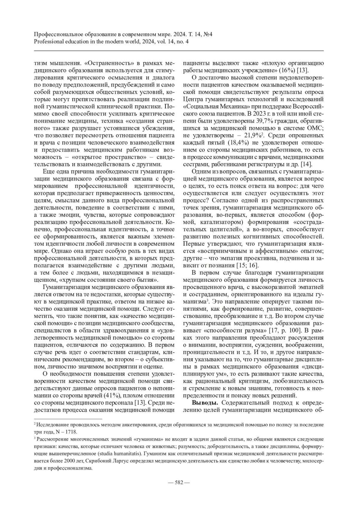 Выводы. Включение и расширение Medical Humanities в медицинском образовании формирует навыки пациенто-ориентированного подхода и тем самым позволяет минимизировать негативные последствия биомедицинской парадигмы современной медицины.