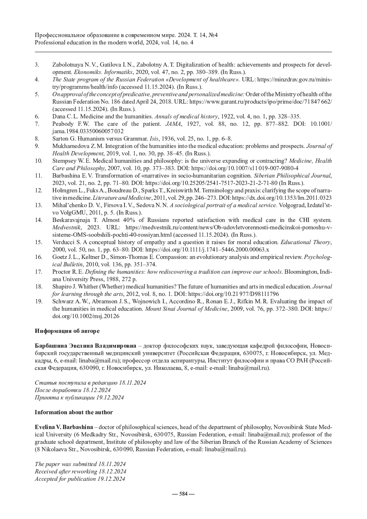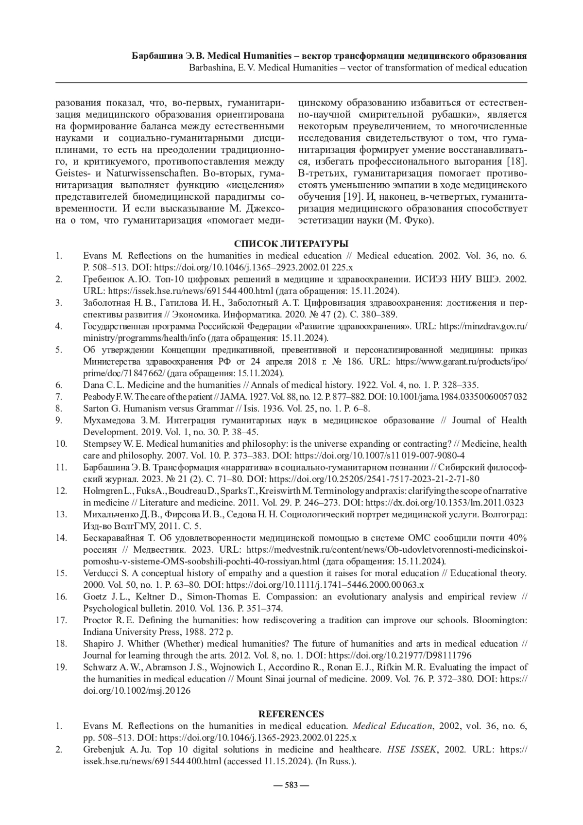 1. Evans M. Reflections on the humanities in medical education // Medical education. 2002. Vol. 36, no. 6. P. 508-513. https://doi.org/10.1046/j.1365-2923.2002.01 225.x