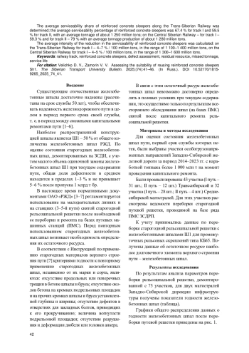В статье представлена оценка остаточного ресурса железобетонных шпал с истекшим первым сроком службы, для проведения которой были выбраны участки особогрузонапряженных направлений ЗападноСибирской железной дороги за период 2014-2023 гг. с наработкой тоннажа более 1 000 млн т на момент проведения капитального ремонта.