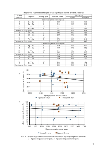 Определена средняя доля годности железобетонных шпал: по Транссибирской магистрали средний процент годности железобетонных шпал составил для I пути - 67,4 %, для II пути - 59,5 % при средней наработке тоннажа около 1 250 млн т; по Среднесибирской магистрали - для I пути - 59,3 % и для II пути 79 % при средней наработке тоннажа около 1 280 млн т.