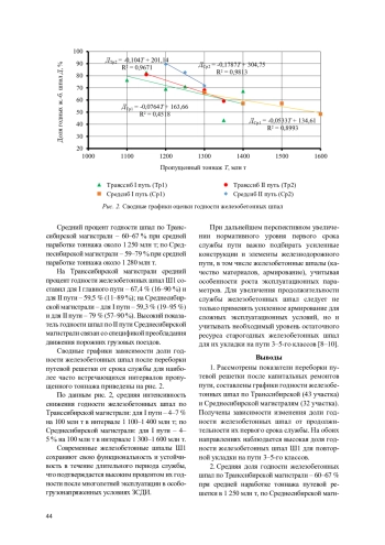 Рассчитана средняя интенсивность снижения годности железобетонных шпал: по Транссибирской магистрали для I пути - 4-7 % на 100 млн т в интервале 1 100-1 400 млн т; по Среднесибирской магистрали для I пути - 4-5 % на 100 млн т в интервале 1 300-1 600 млн т.