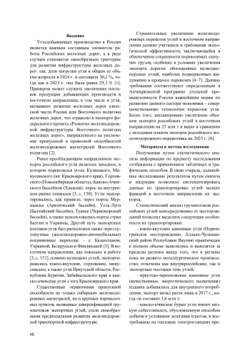 Угледобывающее производство в России является важным составным элементом работы Российских железных дорог, а в ряде случаев становится своеобразным триггером для развития инфраструктуры железных дорог: так, доля погрузки угля в общем ее объеме возросла в 2024 г. и составила 30,2 %, тогда как в 2023 г. она была равна 29,3 % [1]. Примером может служить увеличение поставок продукции добывающих производств в восточном направлении, в том числе и угля, вызвавшее развитие железных дорог азиатской части России или Восточного полигона железных дорог, что отражено в паспорте федерального проекта «Развитие железнодорожной инфраструктуры Восточного полигона железных дорог», направленного на увеличение пропускной и провозной способностей железнодорожных магистралей Восточного полигона [2].