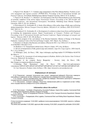 4. Попова Н. Б., Дроздов В. В. Контейнерные грузоперевозки Западно-Сибирской железной дороги // Проблемы антикризисного управления и экономики регионов (ПАУЭР-2023): материалы IX Международной научно-практической конференции. Новосибирск: Издательство Сибирского государственного университета путей сообщения, 2024. С. 58-62. EDN: PANGDE ▼ Контекст
