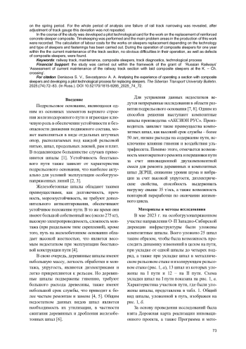Участок с уложенными композитными шпалами оценивался как по состоянию геометрии рельсовой колеи, так и по распределению трудозатрат на линейном участке. Каждая шпала рассматривалась в отдельности по основным параметрам геометрии рельсовой колеи. Наибольший объем работ по содержанию рельсовой колеи на участке с композитными шпалами приходится на весенний период. За весь анализируемый период была выявлена одна неисправность по сужению рельсовой колеи, после регулировки ширины колеи данное отступление не повторялось.