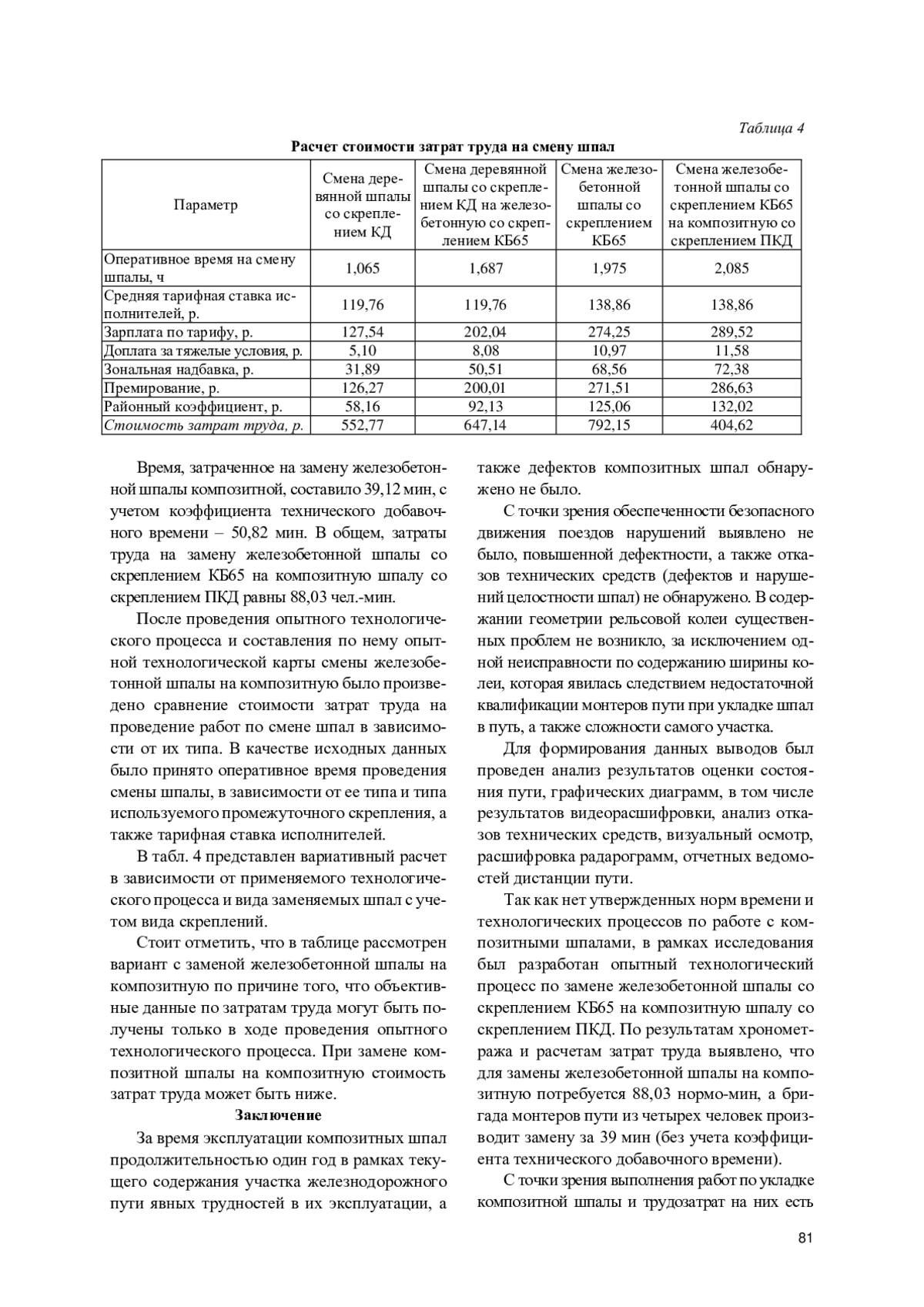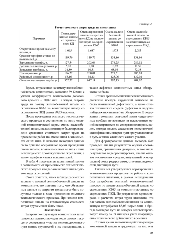 В ходе исследования была разработана опытная технологическая карта работы по замене железобетонной шпалы на композитную. Выполнен хронометраж времени и зафиксированы основные проблемные места в производстве данной работы. Проведен расчет затрат труда на выполнение работ по замене шпал в зависимости от технологии и вида шпал и скреплений. За время эксплуатации композитных шпал продолжительностью один год в рамках текущего содержания участка железнодорожного пути явных трудностей в их эксплуатации, а также дефектов композитных шпал не обнаружено.