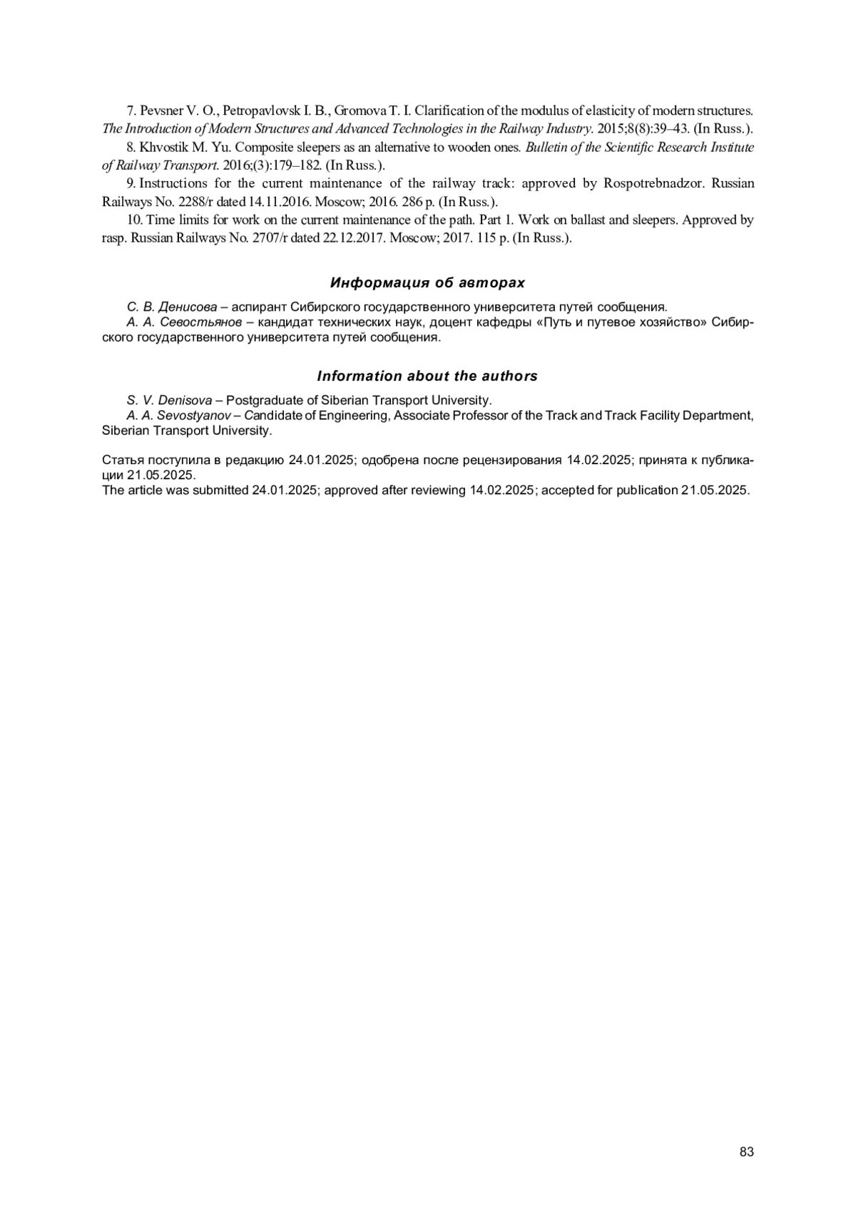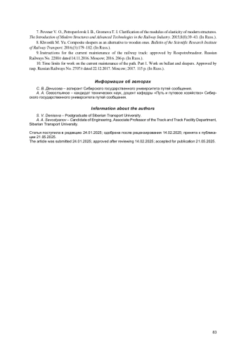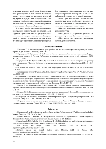2. Карпущенко Н. И., Ардышев И. К. Новые проблемы содержания бесстыкового пути на особогрузонапряженных участках // Вестник Сибирского государственного университета путей сообщения. 2023. № 1 (64). С. 5-14. EDN: YKQPRP