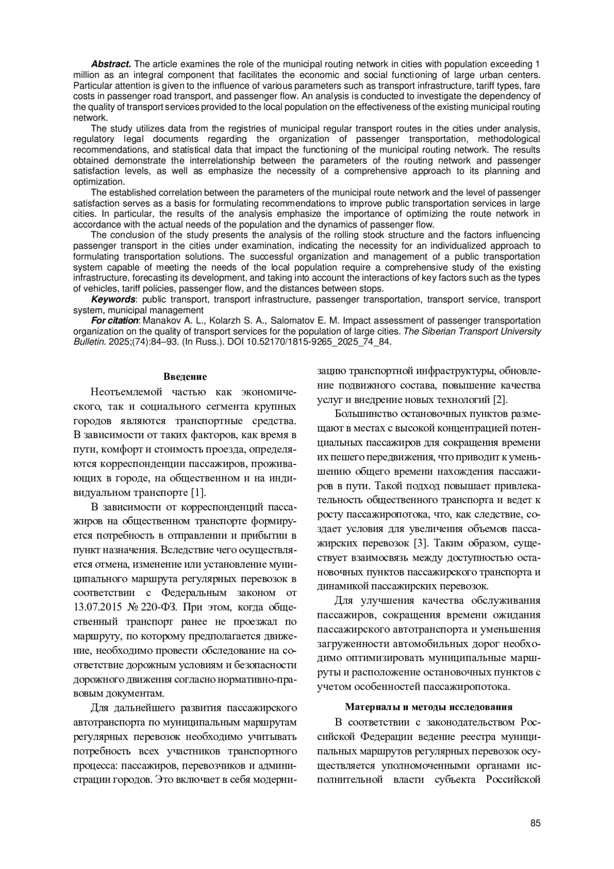 В работе использованы данные из реестров муниципальных маршрутов регулярных перевозок на территории анализируемых городов, нормативно-правовые документы по организации пассажирских перевозок, методические рекомендации и статистические данные, влияющие на функционирование муниципальной маршрутной сети. Полученные результаты демонстрируют взаимосвязь между параметрами маршрутной сети и уровнем удовлетворенности пассажиров, а также указывают на необходимость комплексного подхода к ее планированию и оптимизации.