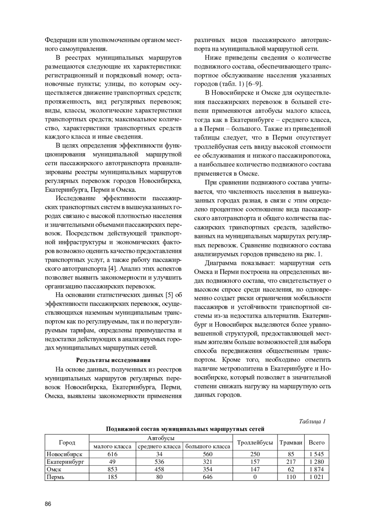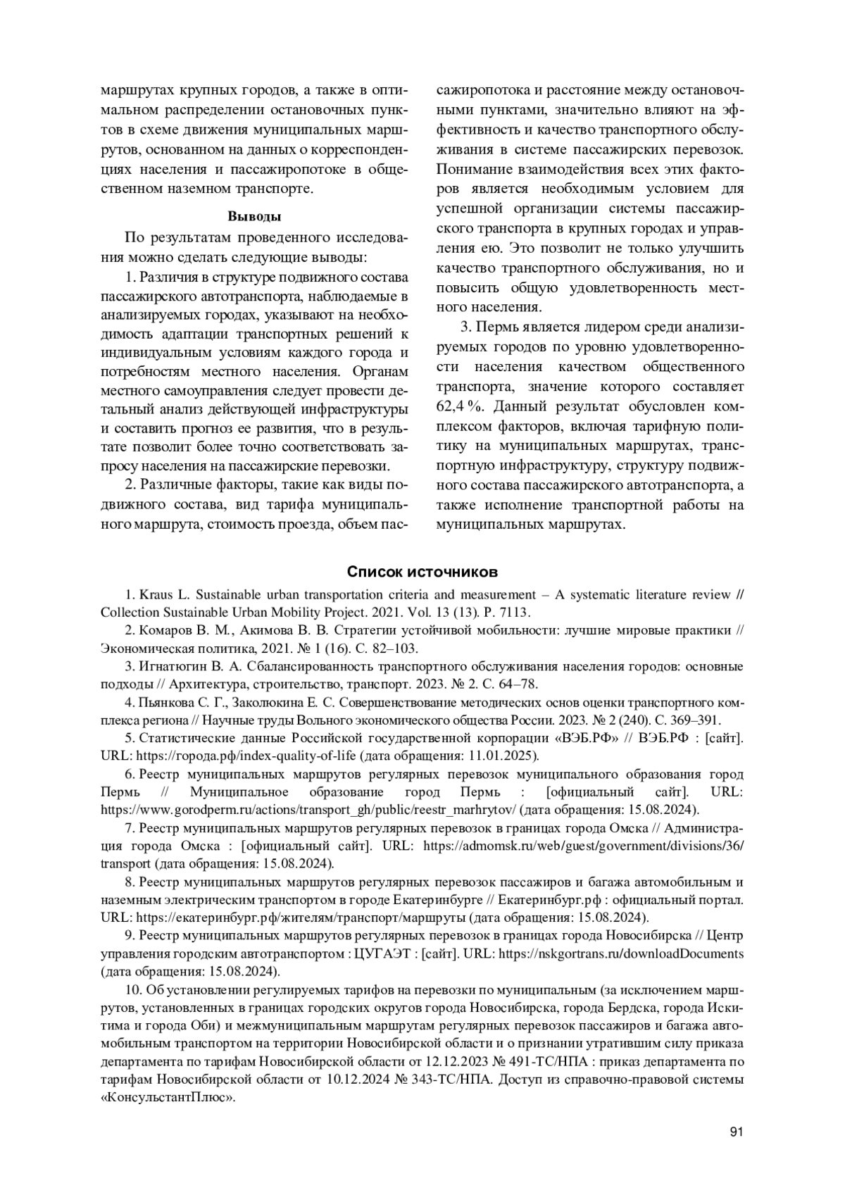 В заключение приведен анализ структуры подвижного состава и факторов, влияющих на пассажирские перевозки в анализируемых городах, который указывает на необходимость индивидуального подхода к формированию транспортных решений. Успешная организация системы общественного транспорта, способной удовлетворить потребности местного населения, и управление ею требуют комплексного исследования существующей инфраструктуры, прогнозирования ее развития и учета взаимодействия ключевых факторов, таких как типы транспортных средств, тарифная политика, пассажиропоток и расстояние между остановочными пунктами.