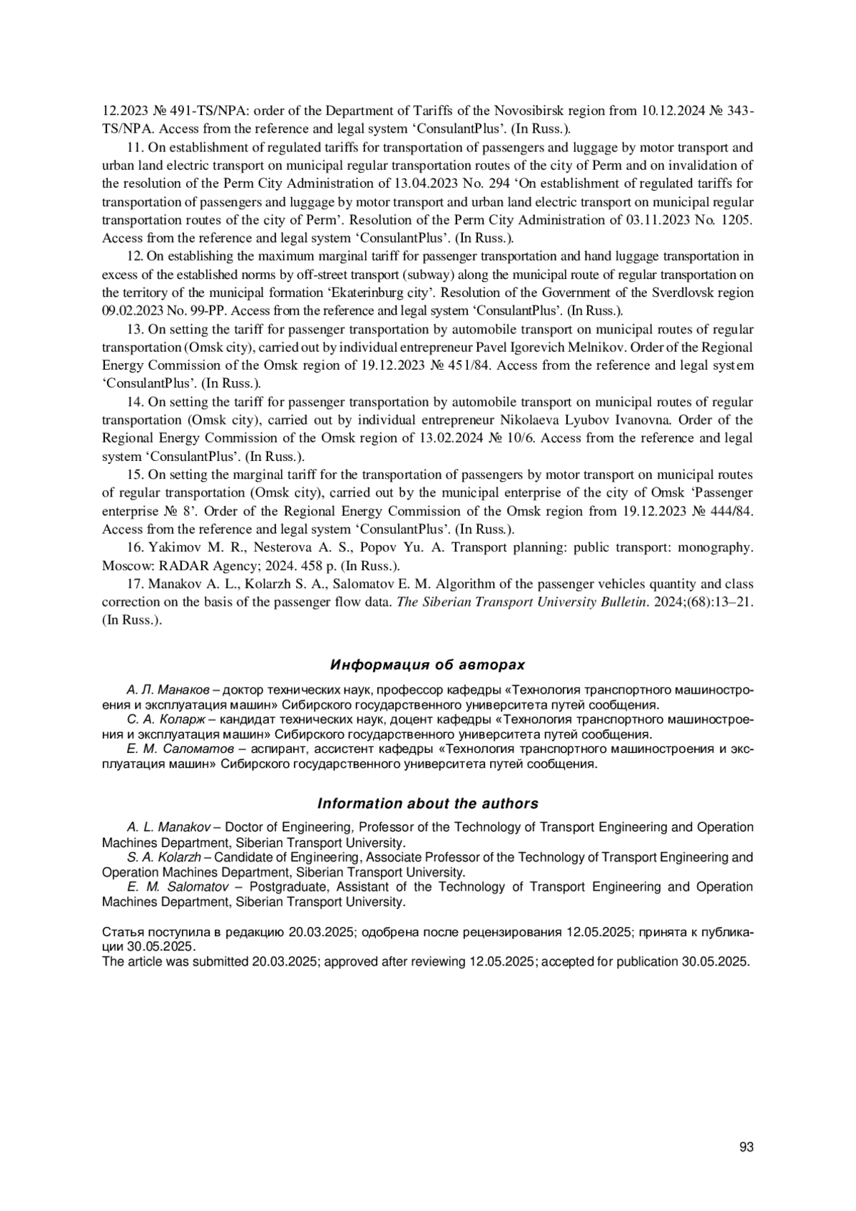 17. 	Манаков А. Л., Коларж С. А., Саломатов Е. М. Алгоритм корректировки количества и класса пассажирских транспортных средств на основе данных пассажиропотока // Вестник Сибирского государственного университета путей сообщения. 2024. № 1 (68). С. 13-21. EDN: KLALYP