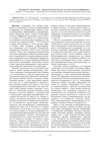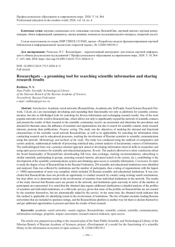 Введение. Научные социальные сети (ResearchGate, Academia. edu, SciPeople, Social Science Research Network, CoLab и др.) получают все большее развитие и расширяют свой функционал не только как платформы для научной коммуникации, но и как полноправные инструменты для поиска разнородной информации и обмена результатами исследований. Одной из наиболее популярных сетей в мире является ResearchGate, позволяющая не только значительно расширить сеть научных контактов и представить результаты своих исследований научному сообществу, получить оценку и определить распространенность и востребованность тематических направлений, влияние ученых и организаций, но и осуществлять поиск научного контента, изучать исследовательские интересы, продвигать свои публикации.