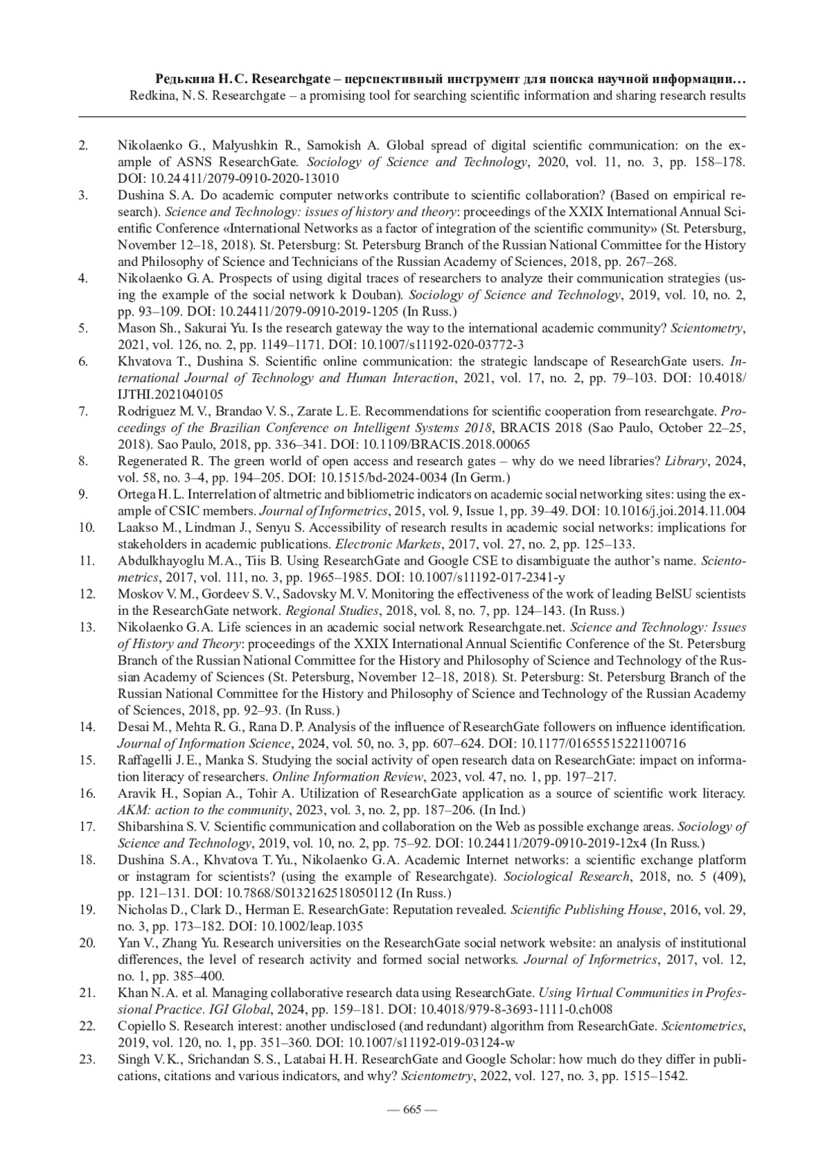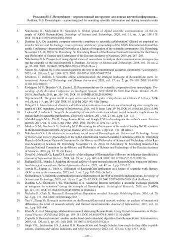 2. Nikolaenko G., Malyushkin R., Samokish A. Global Distribution of Digital Scientific Communication: Сase of ASNS ResearchGate // Sociology of Science and Technology. 2020. Vol. 11, no. 3. P. 158-178. https://doi.org/10.24411/2079-0910-2020-13010