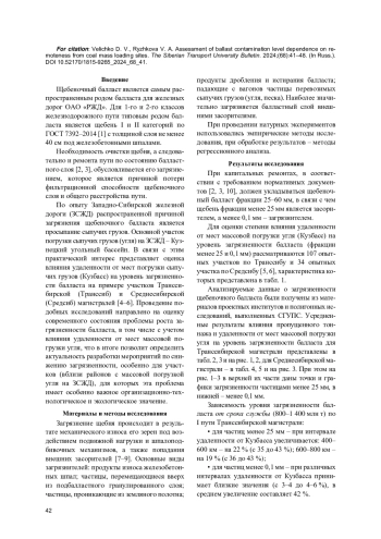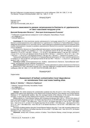 В статье выполнен анализ загрязненности (частицами менее 25 и 0,1 мм) щебеночного балласта железнодорожного пути в зависимости от удаленности от Кузбасса по Транссибирской и Среднесибирской магистралям на 141 опытном участке. Также приводятся усредненные результаты влияния срока службы (пропущенного тоннажа) на уровень загрязненности балласта на участках с одинаковой удаленностью от Кузбасса.