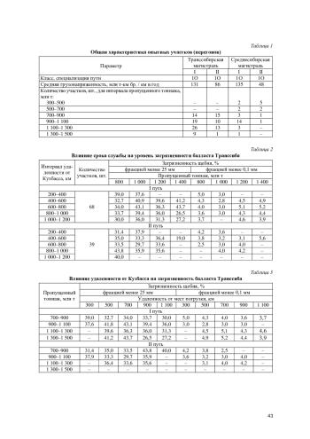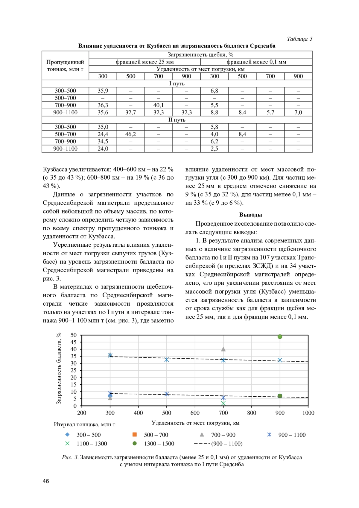 Загрязненность балласта по Транссибирской магистрали с ростом удаленности (от 300 до 1 100 км) от мест массовой погрузки угля (Кузбасс) по I пути: для фракции менее 25 мм при 700-900 млн т в среднем снижается с 37 до 30 %, при 900-1 100 млн т - с 41 до 38 %; для фракции менее 0,1 мм при 700-1 500 млн т -с 5,5 до 3,5 %; по II пути: для фракции менее 25 мм при 900-1 100 млн т - снижается с 36 до 33 %, при 1 1001 300 млн т - с 36 до 34 %; для фракции менее 0,1 мм при 700-1 300 млн т - находится на уровне 3-5 %.