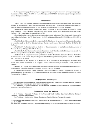 5. Величко Д. В., Толстикова Н. А. Анализ загрязненности щебеночного балласта // Известия Транссиба. 2016. № 3. С. 110-117. EDN: XDEIUB