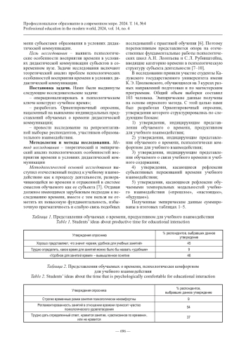 Постановка задачи. Проблема, обусловившая необходимость проведения исследования, заключается в недостаточной психологической проработанности конструкта «время учебного взаимодействия», что в практике преподавания приводит к снижению потенциала дидактической коммуникации.