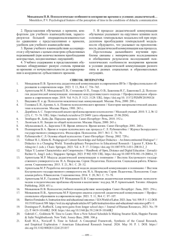 1. Меньшиков П. В. Хронотопы дидактической коммуникации в современном ВУЗе // Профессиональное образование в современном мире. 2023. Т. 13, № 4. C. 756-765.
