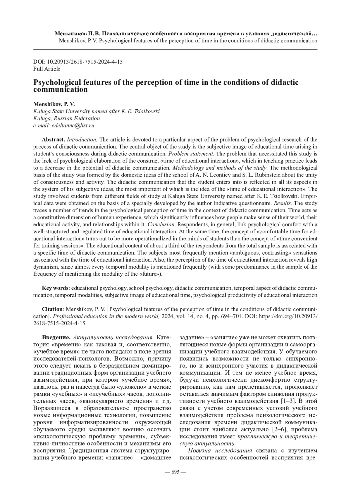 Результаты. В исследовании прослежен ряд тенденций психологического восприятия времени в контексте дидактической коммуникации. Время действует как конститутивное измерение человеческого опыта, которое существенно влияет на то, как люди осмысливают свой мир, свою образовательную активность, отношения в ней.
