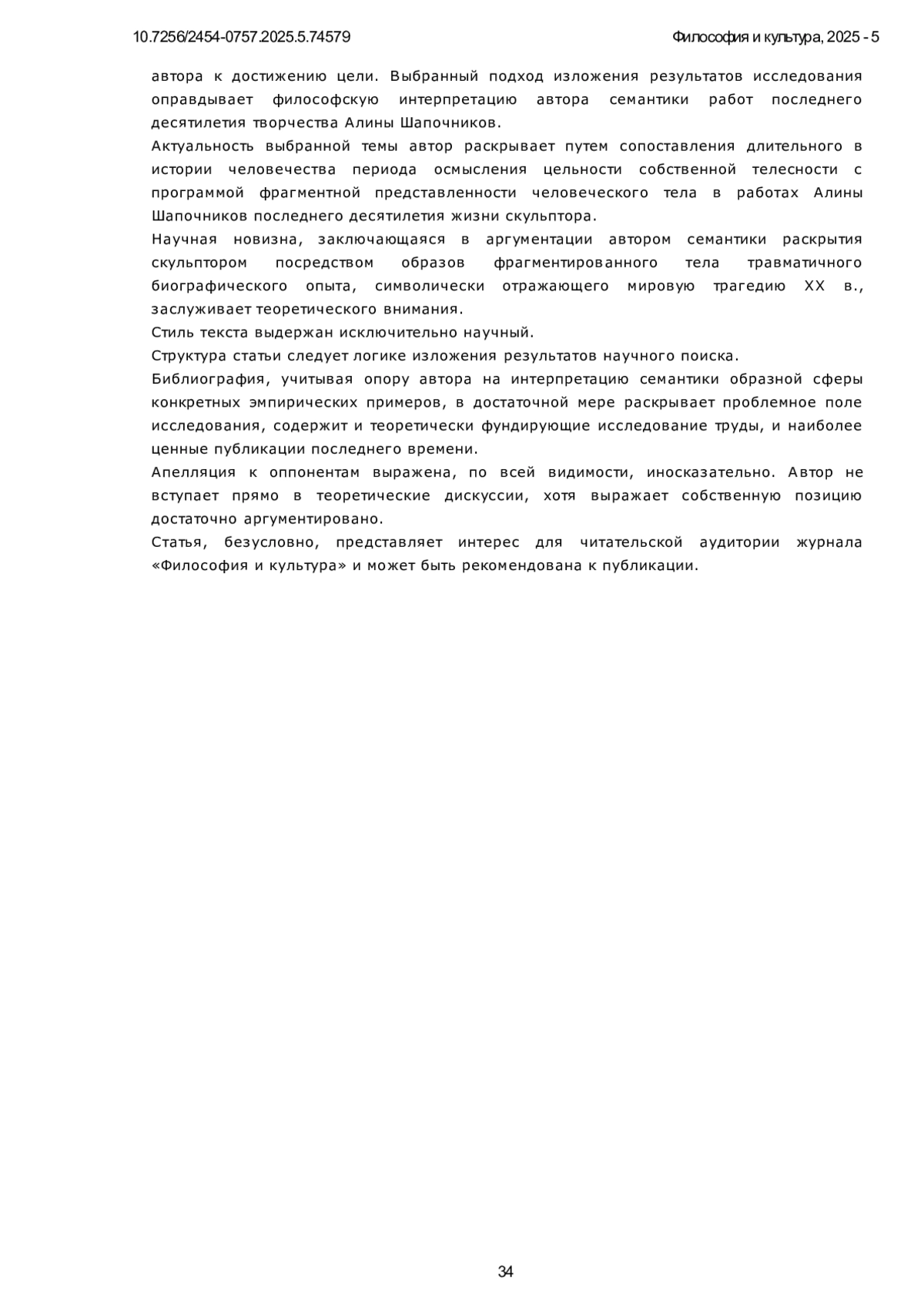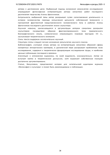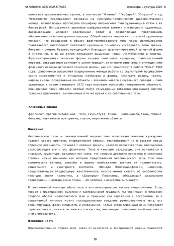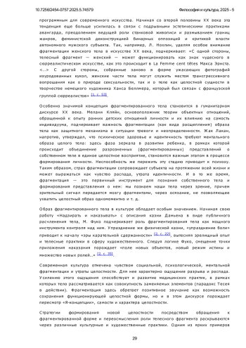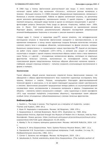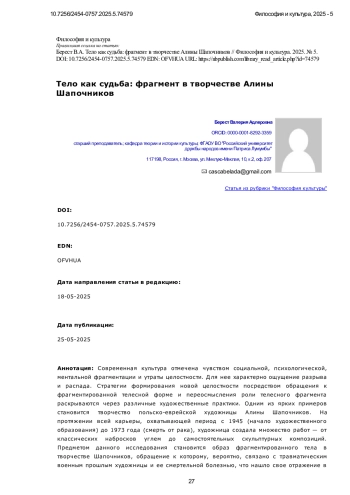 БЕРЕСТ В. А. ТЕЛО КАК СУДЬБА: ФРАГМЕНТ В ТВОРЧЕСТВЕ АЛИНЫ ШАПОЧНИКОВ // ФИЛОСОФИЯ И КУЛЬТУРА. 2025. № 5