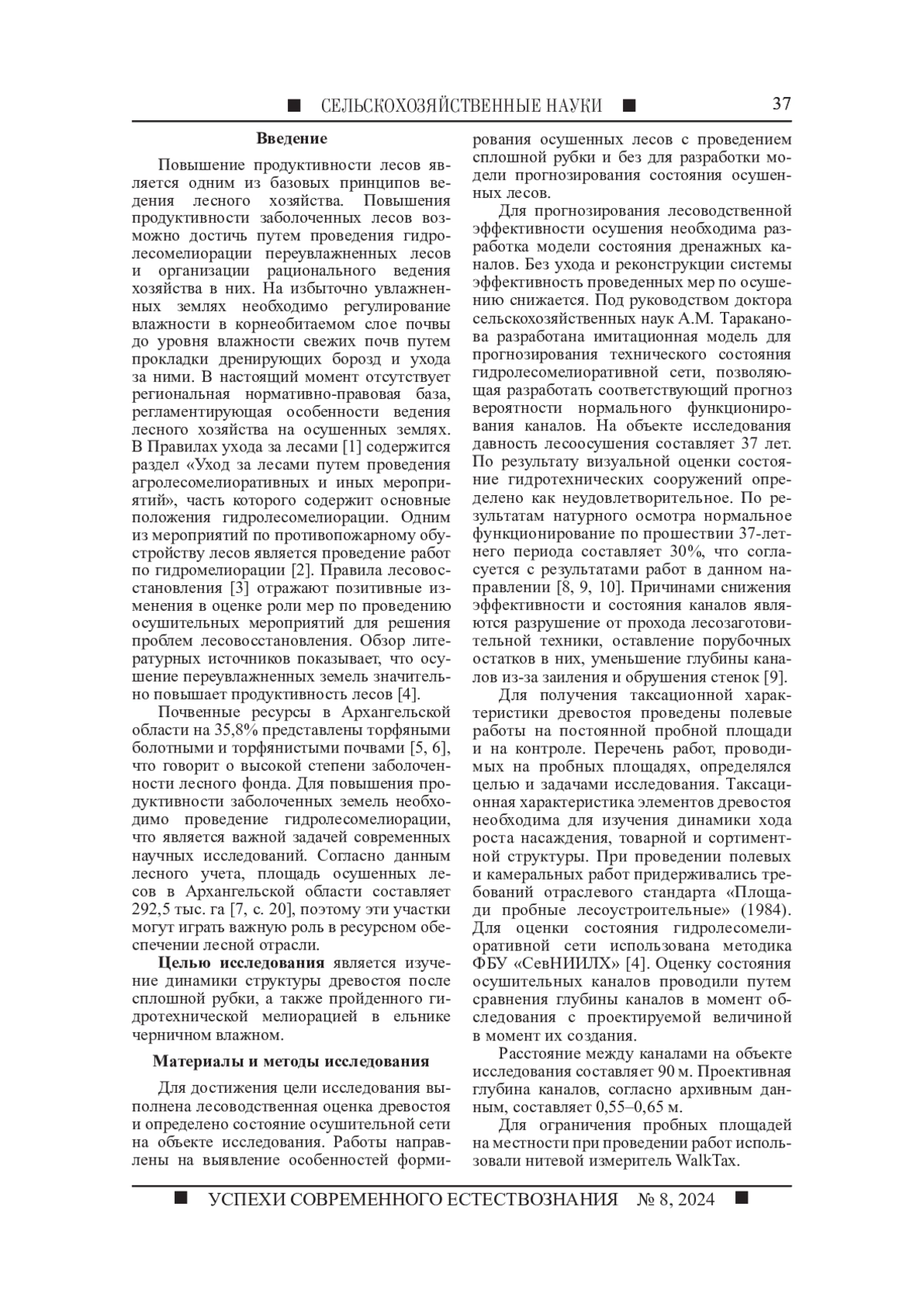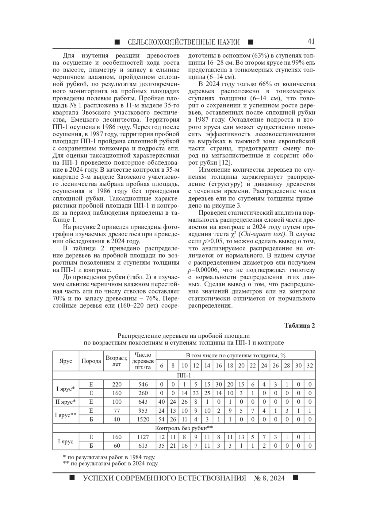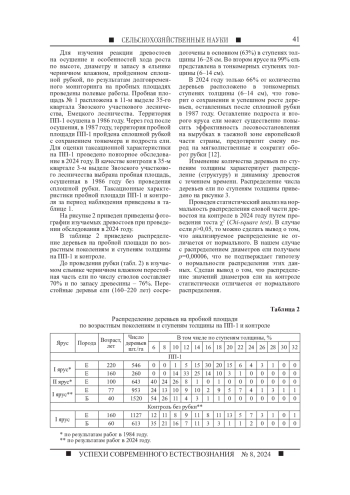Целью исследования является изучение динамики структуры древостоя после сплошной рубки, а также пройденного гидротехнической мелиорацией в ельнике черничном влажном. Для изучения закономерностей роста и динамики структуры насаждений под воздействием природных и антропогенных факторов обследована постоянная пробная площадь, пройденная сплошной рубкой и осушением соответственно 37 и 38 лет назад. Для оценки эффективности проведения рубки с целью заготовки древесины и анализа динамики роста древостоя с рубкой и без рубки проведено обследование контрольной пробной площади, осушенной 38 лет назад без проведения сплошной рубки. По результатам полевого обследования получена таксационная характеристика древостоя на пробе и на контрольном участке. На месте вырубки сформировался смешанный елово-березовый древостой, на контроле сформировался чистый ельник черничный влажный. Проведена оценка состояния гидролесомелиоративной сети на территории объекта исследования. Доля удовлетворительного состояния осушителей составляет 30%. В результате исследования сделан вывод о неудовлетворительном состоянии осушительной сети на объекте исследования. Многолетние исследования являются основой для разработки модели прогнозирования результатов планируемых лесохозяйственных мероприятий в лесных экосистемах на переувлажненных землях. Рассмотрена структура древостоя до рубки оставленной части древостоя, а также древостоя в настоящее время. По результатам полевых работ получены данные о динамике таксационных показателей за период наблюдения.