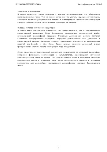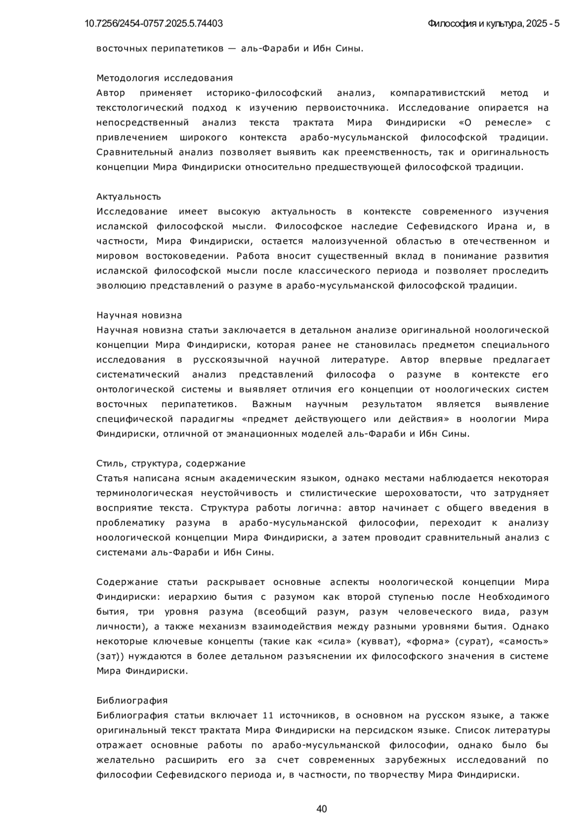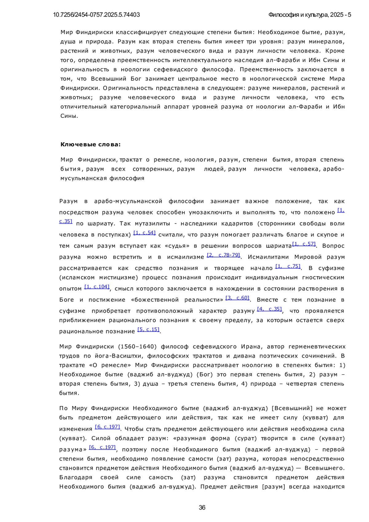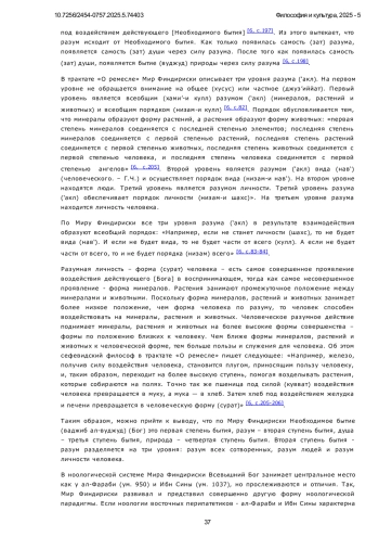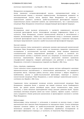 Предметом исследования является учение о разуме Мира Финдириски в трактате «О ремесле» (Рисала-йи синаʻиййа). Объектом исследования являются философские взгляды Мира Финдириски. Разум - высшая психическая функция человека, посредством чего человек отличается от других проявлений жизни на земле. В разные периоды в истории философии мыслители описали разум, что образовался раздел ноологии, и есть философское наследие арабо-мусульманских философов (ал-Фараби, Ибн Сина и др.). Автор подробно рассматривает такие аспекты темы, как Необходимое бытие и разум в структуре степеней бытия Мира Финдириски, парадигму «предмет действующего или действия» ноологической системы философа, три уровня разума, образование всеобщего порядка посредством три уровня разума, на вершине чего находится разумная личность человека. При проведении исследования внимание обращено к филологико-переводческому, логико-смысловому подходу к анализу текста и методу сравнительного анализа, на основе которых Рисала-йи синаʻиййа на русском языке обрел философскую интерпретацию; синтезирована, определена преемственность интеллектуального наследия ал-Фараби и Ибн Сины и оригинальность в ноологии Мира Финдириски. Основными выводами проведенного исследования являются: определения степеней бытия Мира Финдириски, три уровня разума, образование всеобщего порядка. Мир Финдириски классифицирует следующие степени бытия: Необходимое бытие, разум, душа и природа. Разум как вторая степень бытия имеет три уровня: разум минералов, растений и животных, разум человеческого вида и разум личности человека. Кроме того, определена преемственность интеллектуального наследия ал-Фараби и Ибн Сины и оригинальность в ноологии сефевидского философа. Преемственность заключается в том, что Всевышний Бог занимает центральное место в ноологической системе Мира Финдириски. Оригинальность представлена в следующем: разуме минералов, растений и животных; разуме человеческого вида и разуме личности человека, что есть отличительный категориальный аппарат уровней разума от ноологии ал-Фараби и Ибн Сины.