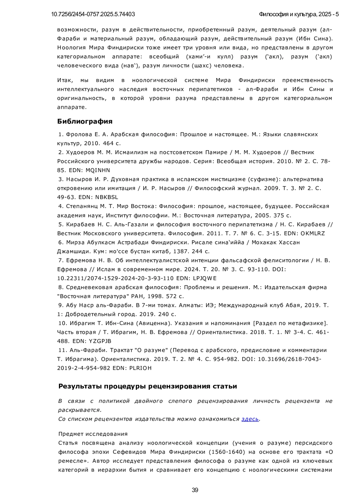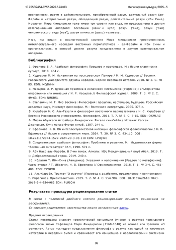 7. Ефремова Н. В. Об интеллектуалистской интенции фальсафской фелиситологии / Н. В. Ефремова // Ислам в современном мире. 2024. Т. 20. № 3. С. 93-110. DOI: 10.22311/2074-1529-2024-20-3-93-110