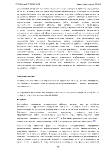 Изоморфизм мироздания предоставляет субъекту познания один из наиболее действенных и эффективных инструментов познания – паттерны форм и законов, реализующиеся на различных уровнях мироздания, в различных предметных областях. Благодаря использованию паттернов возможным становится творчество, представляющее собой имплементацию целостности мира, проявляющуюся через изоморфизм мироздания в виде паттернов [1], а благодаря распознаванию паттернов – осмысление знания, представляющее собой его интеграцию в систему мироздания [2].