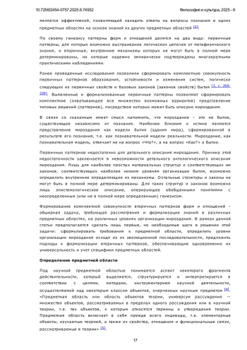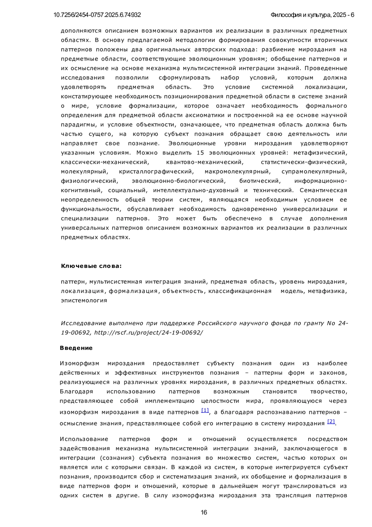 Статья посвящена методологии определения вторичных паттернов систем - шаблонов форм и отношений, не в полной мере детерминированных, для которых невозможно выстраивание логической связи с метафизикой мироздания. Формирование совокупности вторичных паттернов систем осуществляется в несколько этапов. На первом этапе выявляются паттерны в различных предметных областях. На втором этапе вторичные паттерны формулируются в логике и терминах общей теории систем. На третьем этапе для сформированного множества вторичных паттернов выстраивается классификационная модель, позволяющая дополнить “пропущенные” вторичные паттерны, не выявленные при анализе предметных областей, но следующих из логики классификационной модели. На заключительной стадии вторичные паттерны дополняются описанием возможных вариантов их реализации в различных предметных областях. В основу предлагаемой методологии формирования совокупности вторичных паттернов положены два оригинальных авторских подхода: разбиение мироздания на предметные области, соответствующие эволюционным уровням; обобщение паттернов и их осмысление на основе механизма мультисистемной интеграции знаний. Проведенные исследования позволили сформулировать набор условий, которым должна удовлетворять предметная область. Это условие системной локализации, констатирующее необходимость позиционирования предметной области в системе знаний о мире, условие формализации, которое означает необходимость формального определения для предметной области аксиоматики и построенной на ее основе научной парадигмы, и условие объектности, означающее, что предметная область должна быть частью сущего, на которую субъект познания обращает свою деятельность или направляет свое познание. Эволюционные уровни мироздания удовлетворяют указанным условиям. Можно выделить 15 эволюционных уровней: метафизический, классически-механический, квантово-механический, статистически-физический, молекулярный, кристаллографический, макромолекулярный, супрамолекулярный, физиологический, эволюционно-биологический, биотический, информационно-когнитивный, социальный, интеллектуально-духовный и технический. Семантическая неопределенность общей теории систем, являющаяся необходимым условием ее функциональности, обуславливает необходимость одновременно универсализации и специализации паттернов. Это может быть обеспечено в случае дополнения универсальных паттернов описанием возможных вариантов их реализации в различных предметных областях.