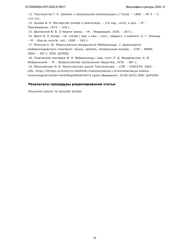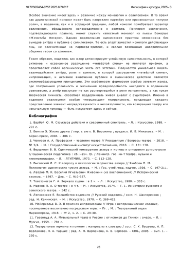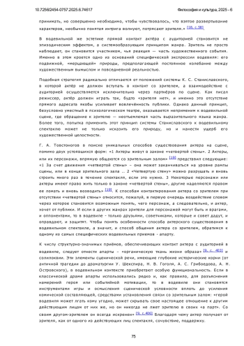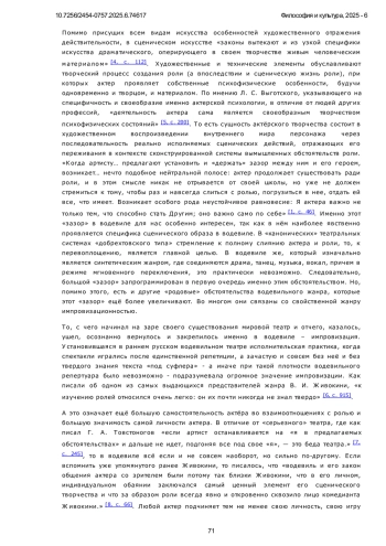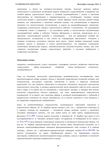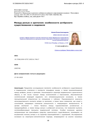 Предметом исследования являются особенности актёрского существования в водевильном спектакле в контексте специфики жанра, а также взаимоотношений между актёром, ролью и зрителем. Анализируется структура водевильного сценического образа, в том числе «зазор» между исполнителем и персонажем, обусловленный синтетической природой водевиля, его импровизационными основами, а также принципиальной открытостью по отношению к публике. Подчеркивается важность непосредственного контакта актера со зрителем, а также таких элементов, как апарт и солилоквий, придающих спектаклю уникальность и «мерцающую» театральность. В центре внимания - поиск баланса между художественной условностью и правдоподобием, а также между ролью и актёрской личностью, что позволяет выявить системообразующие принципы водевильной эстетики. Особое внимание уделено импровизации как важнейшему средству сценического существования, влияющему на внутреннюю технику актера и на характер взаимодействия с аудиторией. Исследование основано на структурно-семиотическом подходе, опирающемся на анализ жанровых признаков, а также на историко-культурном методе. Научная новизна работы заключается в выявлении устойчивой модели актёрского существования в водевиле как особой формы сценического бытия, в которой взаимодействие с ролью и зрителем обусловлено не стремлением к перевоплощению, а построением «зазора» между личностью актера и сценическим образом. Таким образом после анализа связей между актером, его персонажем и зрителем вытекает вывод, что импровизация в водевиле является не стилистическим отступлением, а одним из жанрообразующих элементов, создающих уникальность каждого сценического события. Установлено, что разрушение «четвёртой стены» в водевиле - не случайный приём, а органическая составляющая взаимодействия актёра и публики. Прямое обращение к зрителю, вовлечение его в действие, использование апартов и солилоквиев - всё это формирует особый тип театральности, основанный в том числе на «мерцающей реальности». Иллюзия и игровая условность постоянно сменяют друг друга. Через разбор отношений между актером, ролью и зрителем в статье демонстрируется, что водевиль показывает устойчивую театральную модель, противоположную психологическому театру, при этом сохраняя внутреннюю правду сценического действия и высокие требования к актёрскому мастерству.