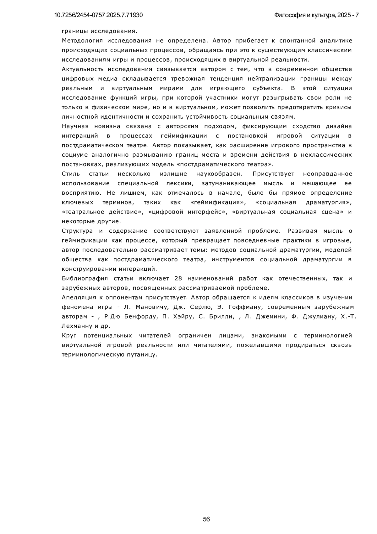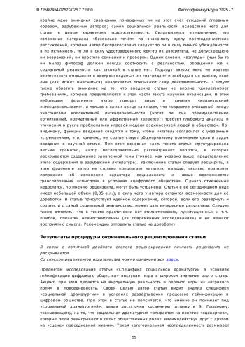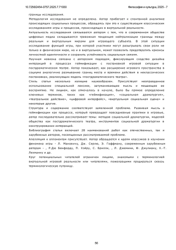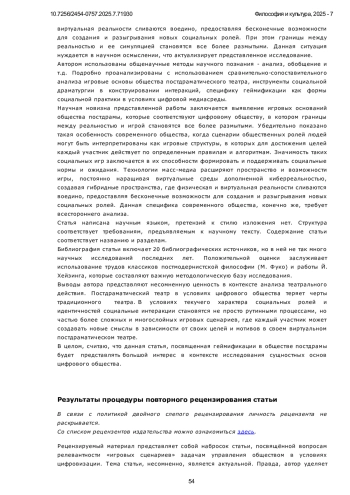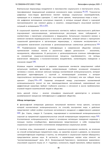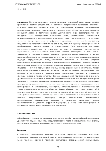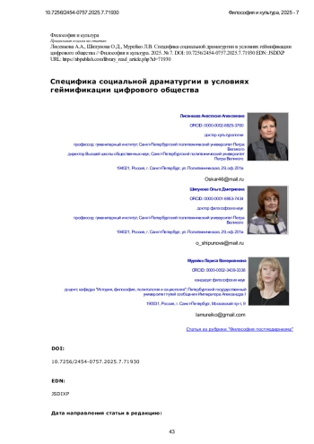 В статье проводится анализ концепции социальной драматургии, которая приобретает особую актуальность в условиях современного цифрового общества. Основное внимание уделяется игре как центральному элементу, позволяющему моделировать социальные интеракции и создавать новые формы мотивации активного поведения людей в различных сферах деятельности. Игра рассматривается как инструмент для разыгрывания социальных ролей, формирования коллективной интенциональности и трансформации культурных норм. Подчеркивается, что игровые сценарии, распространяемые в цифровых медиасредах и на онлайн-платформах, создают новые механизмы влияния на сознание, размывая границы между реальным и воображаемым, индивидуальным и коллективным. Эти изменения оказывают значительное воздействие на социальные структуры и процессы, открывая новые перспективы для исследования потенциала методов драматургии и роли медиа-технологий в контроле сложной динамики публичной сферы. Принципы и методы социальной драматургии рассматриваются в статье с точки зрения междисциплинарного подхода, определяющего методологическую установку в анализе процесса геймификации цифрового общества и конструировании интеракций. Научная новизна исследования заключается в анализе постдраматического театра как игровой модели общества, в которой размываются границы между реальностью и симуляцией. Любой социальный сценарий становится открытым для множественных интерпретаций, что приводит к необходимости переосмысления традиционных подходов к пониманию свободы, закона и текста культуры. Выводы исследования подчёркивают значимость драматургического анализа в развитии современного знания, его междисциплинарную установку и усиление включения традиционных академических областей философии, культурологии, социологии, психологии, лингвистики и других в исследование роли геймификации в повседневной, культурной, организационной и институциональной жизни современного цифрового общества. Таким образом, текст представляет собой исследование функций игры как инструмента социальной драматургии, её влияния на формирование динамичных связей, идентичностей и коллективных интенциональностей в условиях современных медиасред. Авторы подчёркивают необходимость переосмысления традиционных подходов к пониманию культурных практик взаимодействия в условиях цифровой медисреды, а также роли геймификации в размывании границ между реальностью и симуляцией.