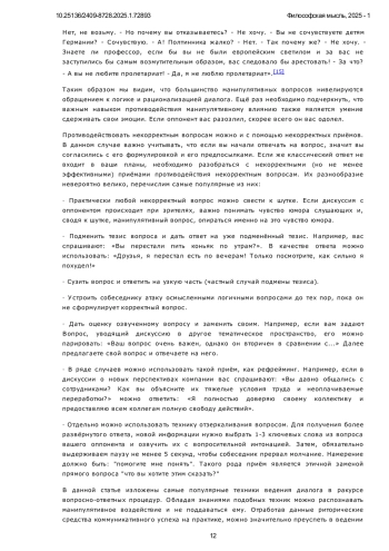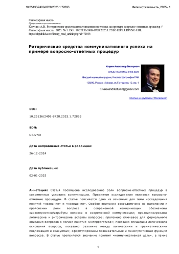 Статья посвящена исследованию роли вопросно-ответных процедур в современных условиях коммуникации. Предметом исследования являются вопросно-ответные процедуры. В статье поясняется одно из основных для темы исследования понятий «незнание» и «неведение». Особое внимание сосредоточено на выявлении и прояснении роли вопроса в современной коммуникации: обозначены характеристики/атрибуты вопроса в современной коммуникации; проанализированы логические и риторические аспекты вопросов; прояснено ключевое для формального описания вопросов в логике понятие «интеррогатива»; показана специфика логического основания вопроса; показано различие между логическими и грамматическими подлежащим и сказуемым; сформулированы познавательные и манипулятивные функции вопросов. В статье проясняется значение понятия «коммуникативная цель», а также предлагается вариант разделения вопросов на корректные и некорректные в зависимости от коммуникативной цели. В статье используются методы сравнительного и контекстного анализа, обобщения, классификации, а также логический метод. Текст сопровождается наглядными, выразительными примерами, что позволяет читателю лучше понять основные идеи исследования. Статья будет полезна как студентам, аспирантам, изучающим риторику, теорию аргументации, коммуникативные техники, так и широкому кругу читателей. В статье предложена классификация некорректных вопросов: вопрос, уводящий дискуссию в другое тематическое пространство, вопрос-побуждение к действию, вопрос с неполным перечнем альтернатив, вопрос-манипулирование предпосылкой, вопрос-уловка, вопрос-гипотеза, Вопрос-дискредитация, вопрос-манипуляция к невежеству, варианты как именно с помощью вопросов могут претворяться в жизнь манипуляции к чувствам: вины, жалости, страха, справедливости, безотказности и пр. Также предложена методика ответов на вопросы разных видов как в личном, так и профессиональном коммуникативном взаимодействии; приведены общие рекомендации ответных процедур, продемонстрированы и проанализированы виды корректных ответов как на корректные вопросы, так и на некорректные вопросы; продемонстрированы и проанализированы виды некорректных ответов на корректные вопросы и некорректные вопросы.