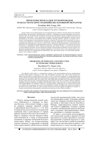 Целью данного исследования является всесторонний анализ наиболее опасных процессов и явлений, возникающих при прокладке трубопроводов в районах с прерывистым распространением многолетнемерзлых пород. В ходе работы использовались методы ретроспективного анализа и обработки результатов инженерных изысканий, а также оценочные методики для проведения районирования участков трассы трубопровода. По итогам исследования были подробно описаны наиболее опасные и сложные для теплового моделирования и проектирования процессы и явления. Результаты работы включают как описательную часть вскрытого геологического строения исследуемой территории, так и систематизированную ландшафтную характеристику участка в соответствии с трудностью проектирования и эксплуатации трубопровода. По ландшафтному районированию выделено 5 крупных районов и 15 участков вдоль трассы исследуемого трубопровода. Были определены критерии для оценки опасных геологических процессов с использованием балльного метода и проведена оценка по выделенным ключевым участкам. Кроме того, проведено ранжирование участков до уровня подрайонов, что позволяет более точно оценить риски и разработать стратегии для минимизации потенциальных угроз при строительстве и эксплуатации трубопроводов в этих сложных условиях.
