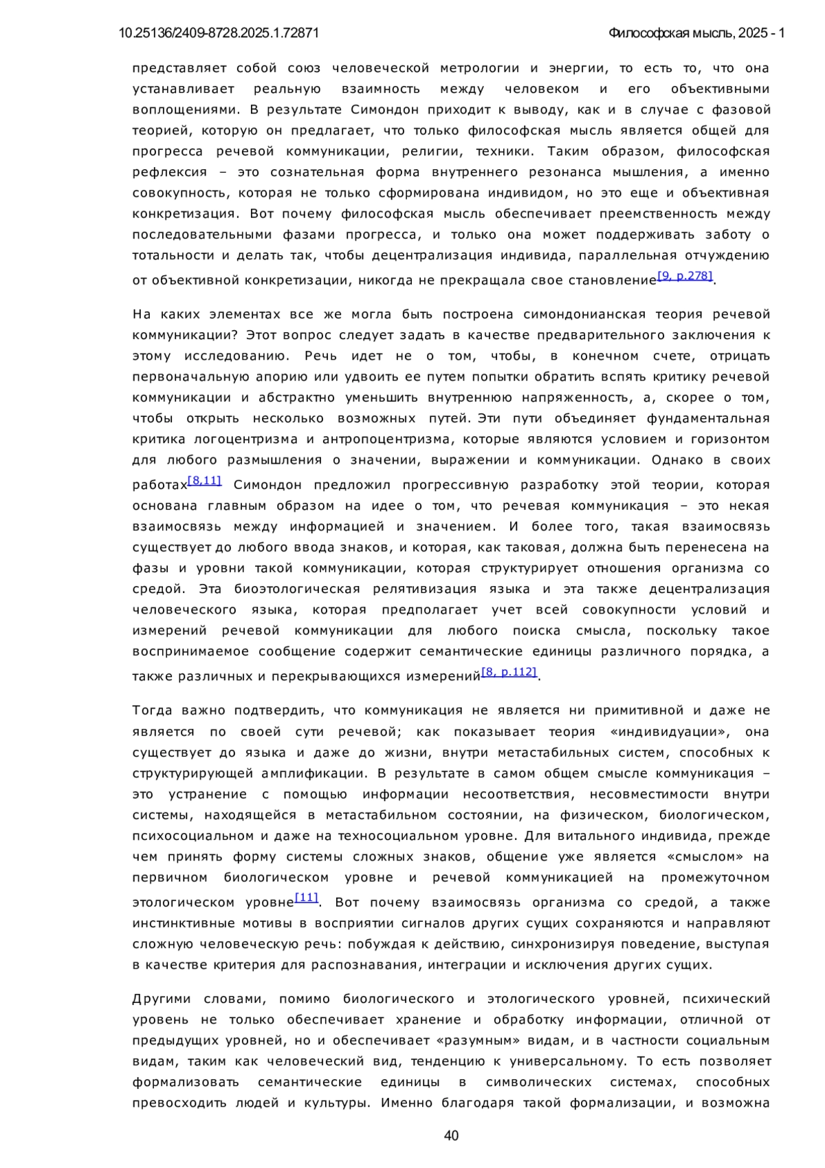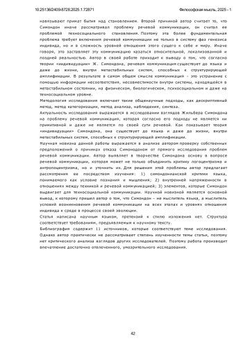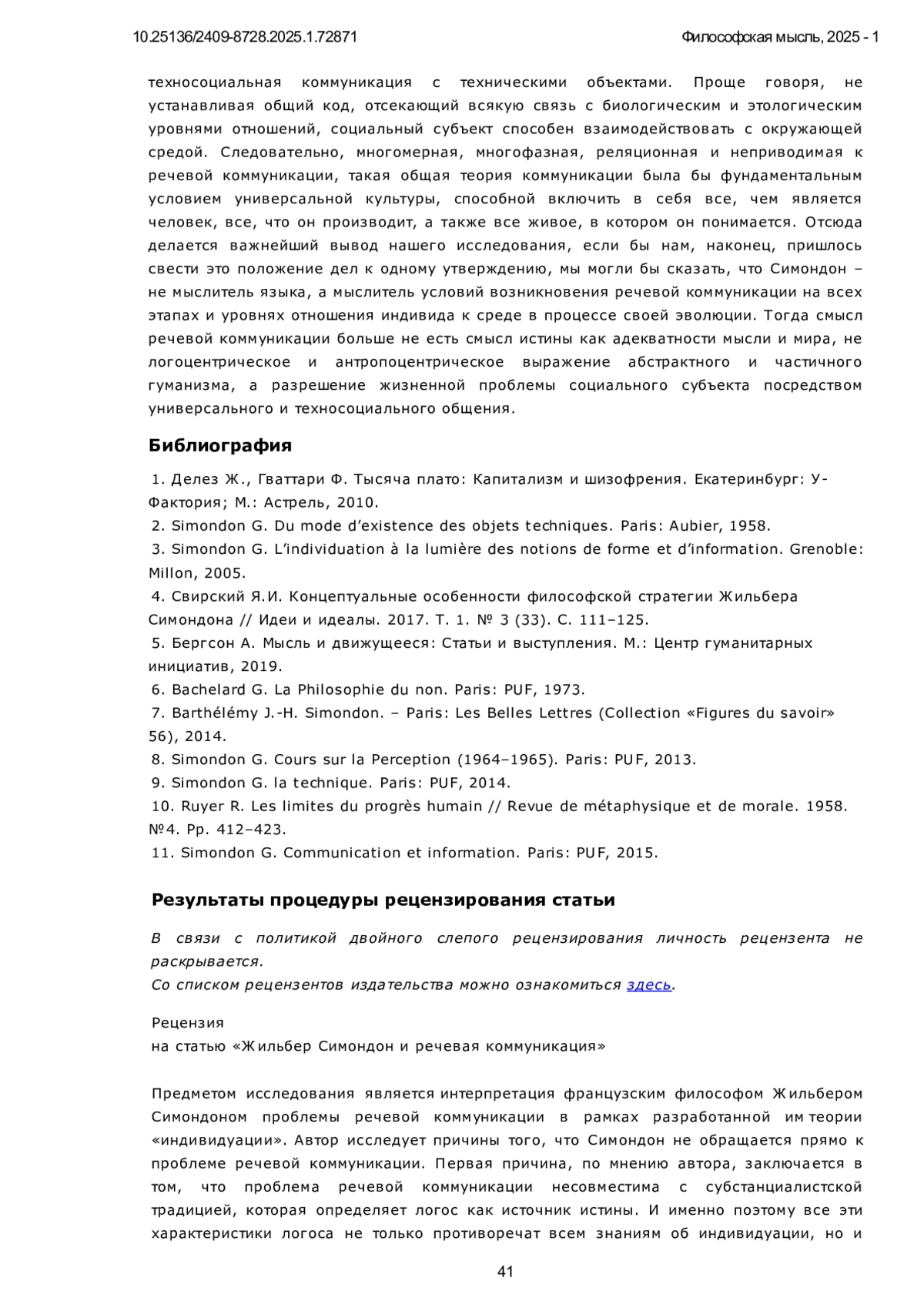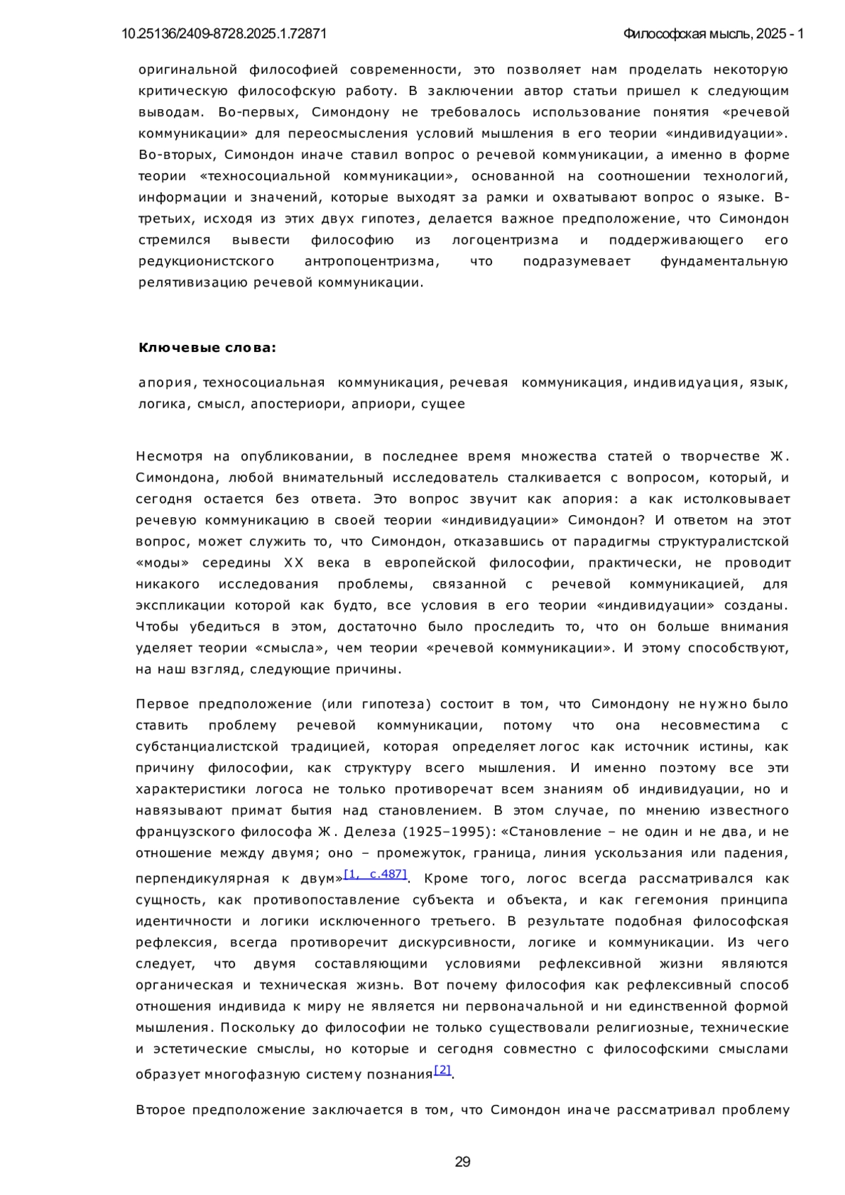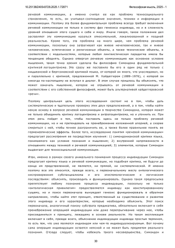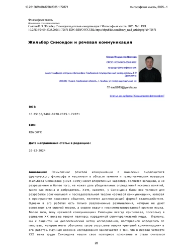 Осмысление речевой коммуникации в мышлении выдающегося французского философа и мыслителя в области техники и технологических новшеств Жильбера Симондона (1924-1989) носит апоретичный характер, является загадкой, а не разрешением и более того, не может дать убедительных определений искомых понятий, таких как истина и добродетель. Хотя, кажется, у Симондона были все условия для разработки оригинальной и последовательной теории «речевой коммуникации», которая в пространстве языкового общения, является доминирующей формой взаимодействия. Однако в его работах есть только разрозненные размышления, которые не дают основания для строгой теории, а скорее ведут к несистематизированной критике языка. Более того, тему «речевой коммуникации» Симондон всегда критиковал, поскольку в середине XX века ее теория являлась парадигмой структуралистской моды. Поэтому, мы с акцентом на диалектический метод исследования, постараемся определить те гипотезы, которые могут объяснить такое отсутствие теории «речевой коммуникации» в его работах. Научная новизна исследования заключается в том, что в первой четверти XXI века труды Симондона нашли свое повторное признание и стали считаться оригинальной философией современности, это позволяет нам проделать некоторую критическую философскую работу. В заключении автор статьи пришел к следующим выводам. Во-первых, Симондону не требовалось использование понятия «речевой коммуникации» для переосмысления условий мышления в его теории «индивидуации». Во-вторых, Симондон иначе ставил вопрос о речевой коммуникации, а именно в форме теории «техносоциальной коммуникации», основанной на соотношении технологий, информации и значений, которые выходят за рамки и охватывают вопрос о языке. В-третьих, исходя из этих двух гипотез, делается важное предположение, что Симондон стремился вывести философию из логоцентризма и поддерживающего его редукционистского антропоцентризма, что подразумевает фундаментальную релятивизацию речевой коммуникации.